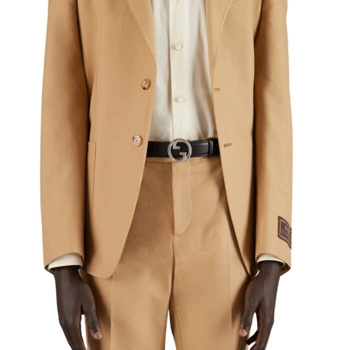 a black leather belt that stands as a testament to this ethos. Crafted from luxurious black leather, this accessory exudes sophistication and understated elegance, while its gold-toned hardware adds a touch of opulence and refinement. The focal point of this belt is its round Interlocking G buckle, an archival iteration of the House’s iconic monogram hardware, which infuses the accessory with a sense of heritage and timeless appeal.