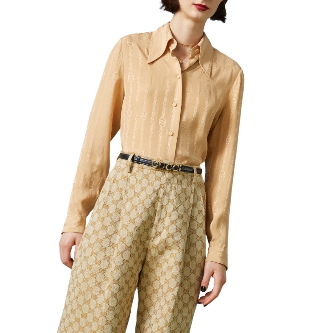 At Gucci, our dedication to reimagining classic designs, a timeless piece that embodies our commitment to luxury and innovation. Crafted from supple Gucci Buckle Thin Belt leather, this thin belt is adorned with the iconic Gucci logo hardware in a shiny gold tone, adding a touch of sophistication to any ensemble.