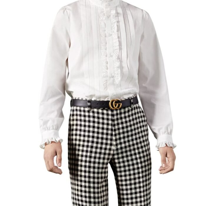 Accentuating this belt’s allure is the aged gold-toned hardware, including the signature Double G buckle, a hallmark of our commitment to exquisite detailing and heritage-inspired design. This emblematic adornment serves as a testament to the enduring legacy of the GG Marmont collection, elevating this accessory to a coveted symbol of luxury and refinement.