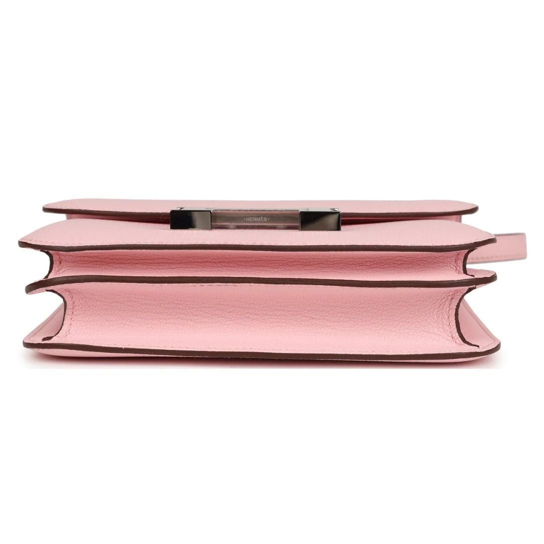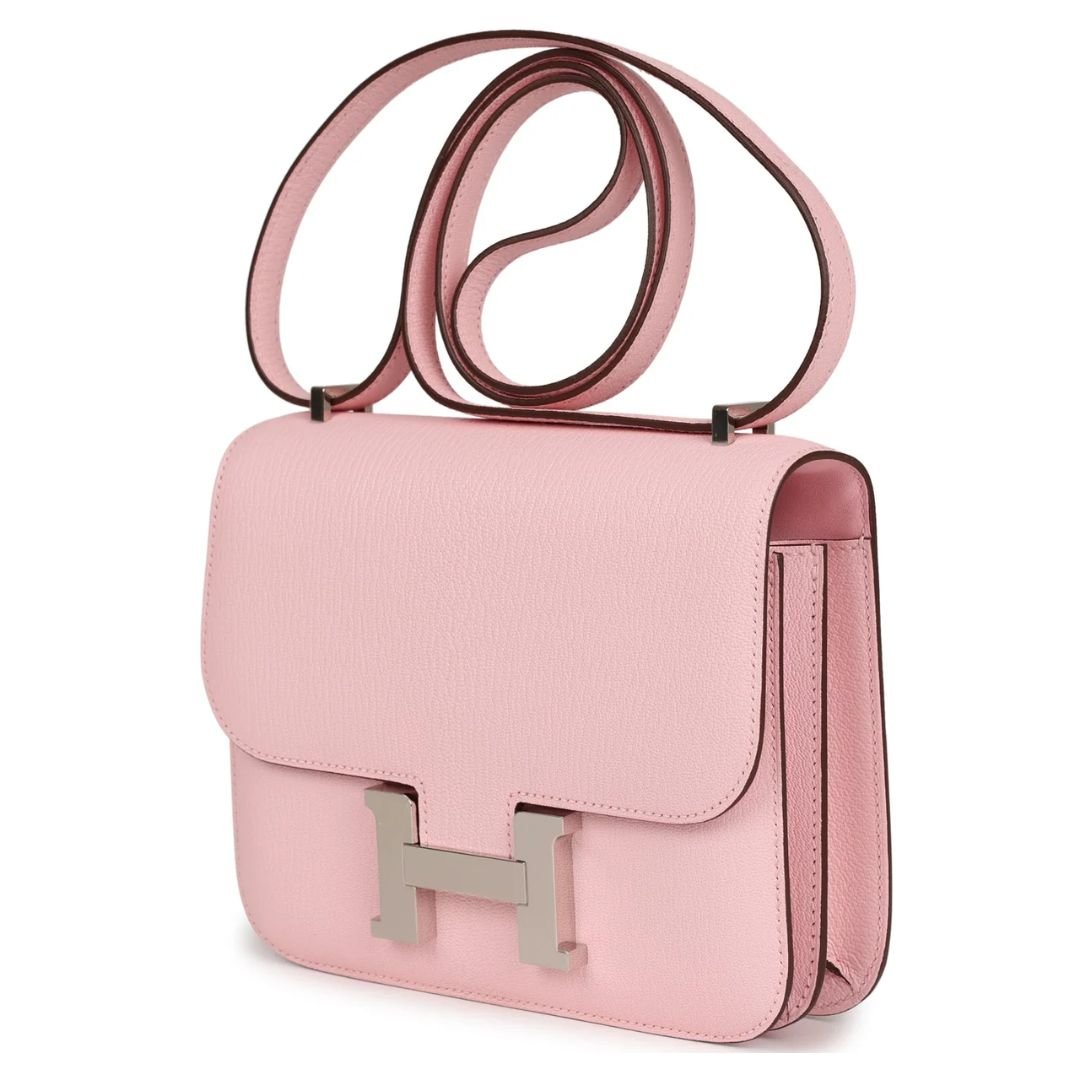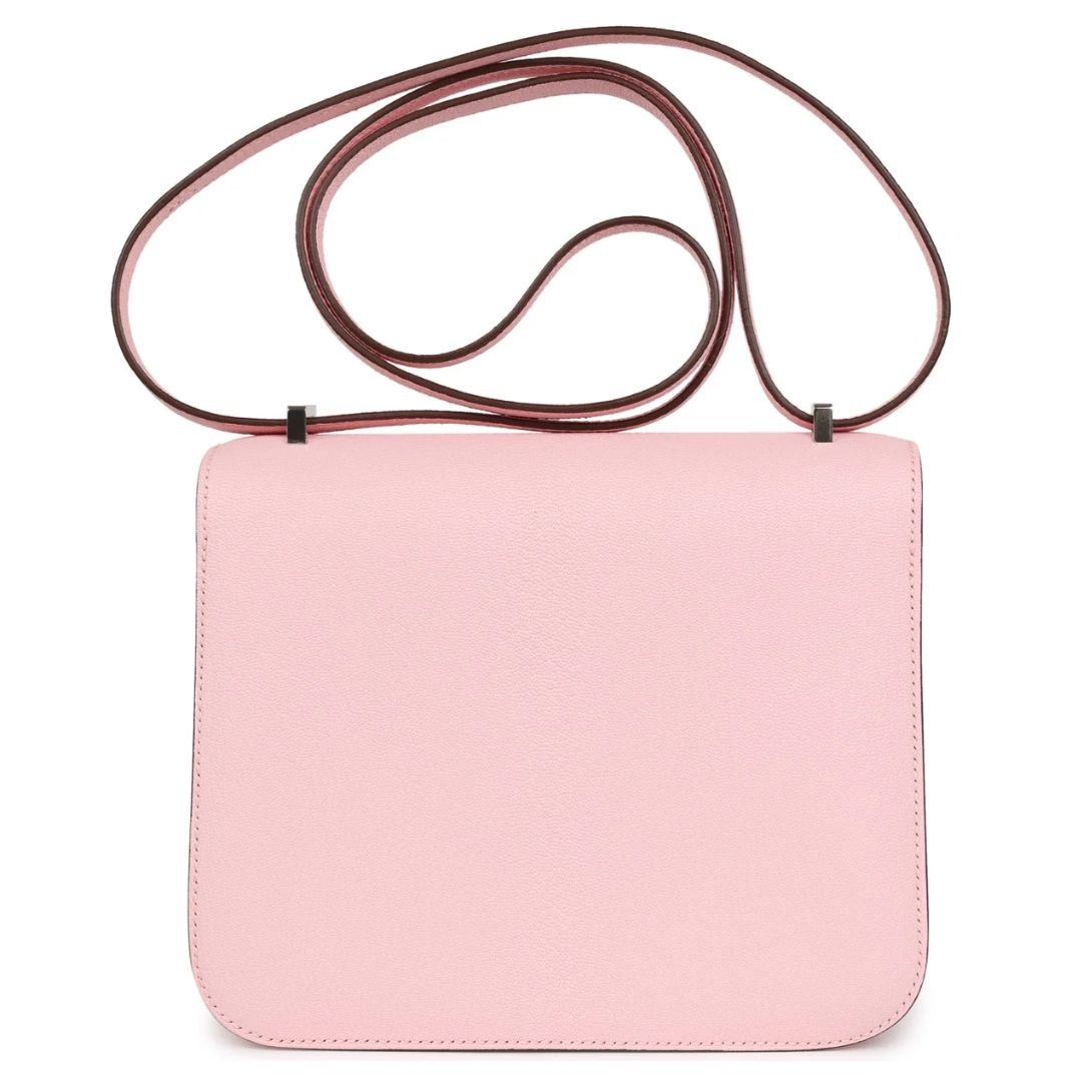 The Hermès Constance in Rose Sakura Chevre leather with palladium hardware is a sophisticated and stylish bag. It features tonal stitching and a metal “H” snap lock closure. The bag comes with an adjustable shoulder strap, providing flexibility in how it can be worn.