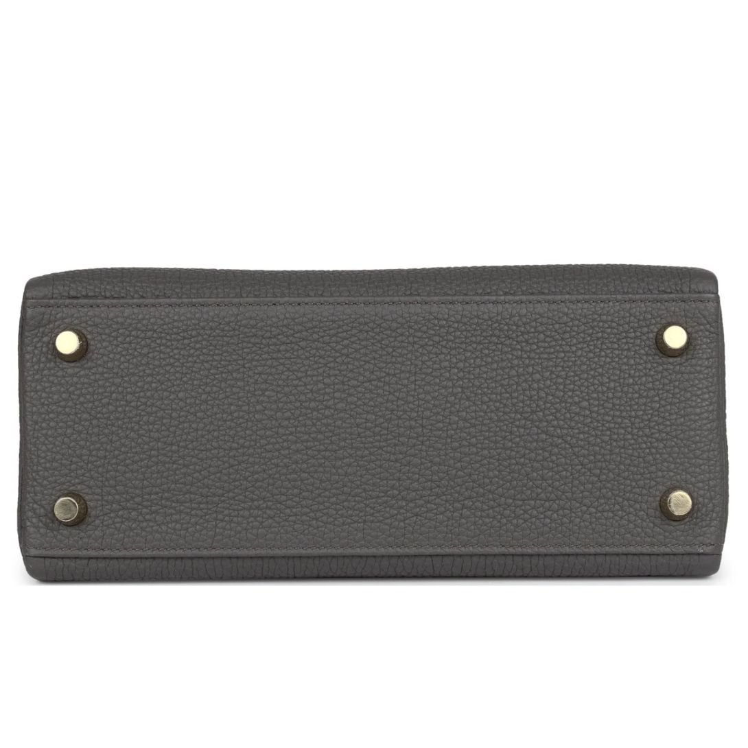 This Hermès Kelly, in the Retourne style, is crafted from Etain Togo leather with gold hardware, showcasing timeless elegance. The bag features tonal stitching, a front flap with two straps and a center toggle closure, a clochette with a lock and two keys, a single rolled handle, and an optional shoulder strap for versatility.