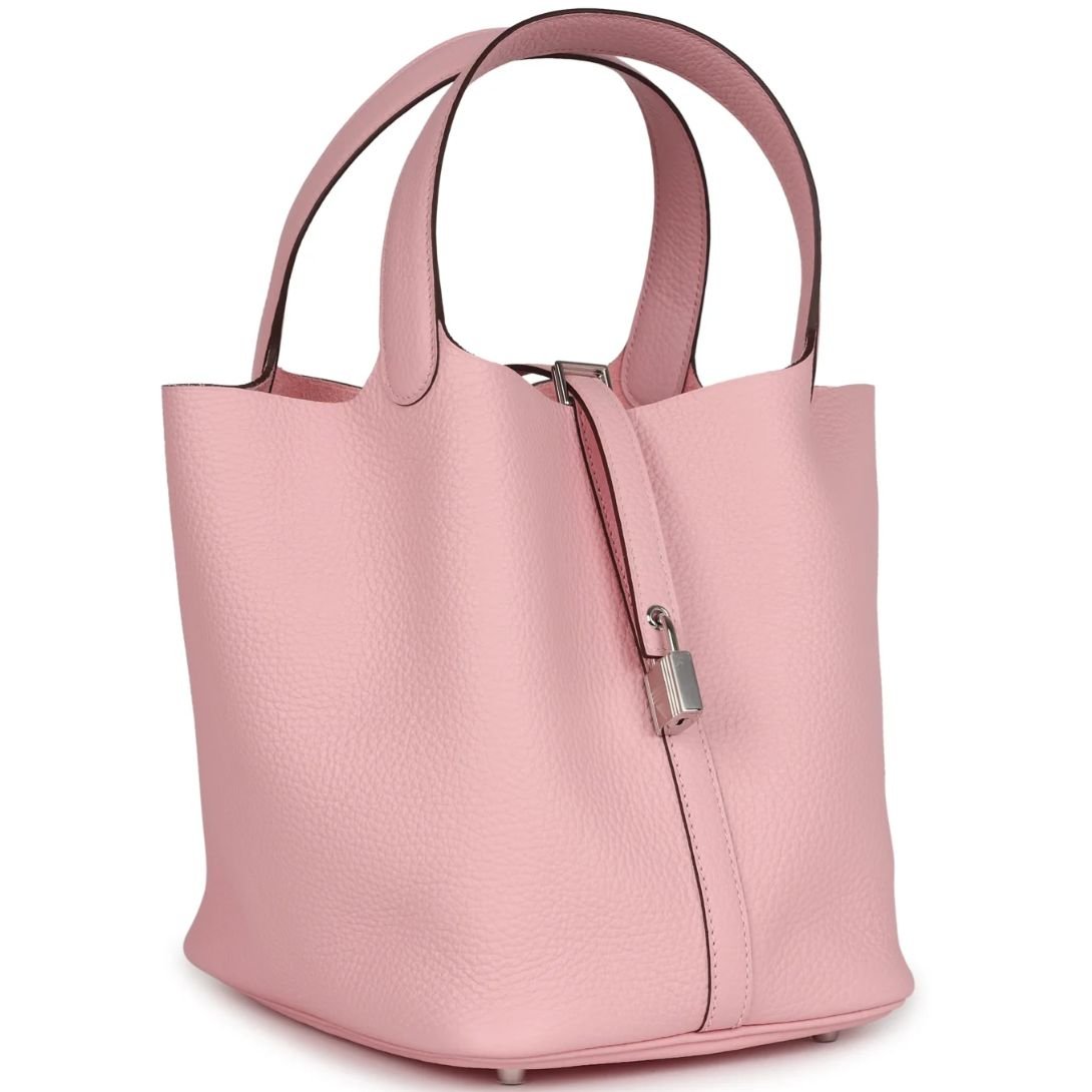 The Hermès Picotin in Rose Sakura is a brand-new, luxury bag that combines elegance and functionality with its refined design and secure closure.