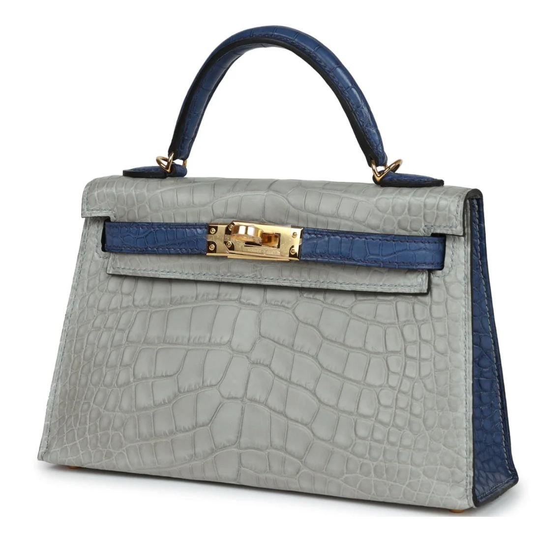 - Leather: Gris Perle and Bleu de Malte Matte Mississippiensis alligator, offering a stunning, unique texture that exudes luxury.