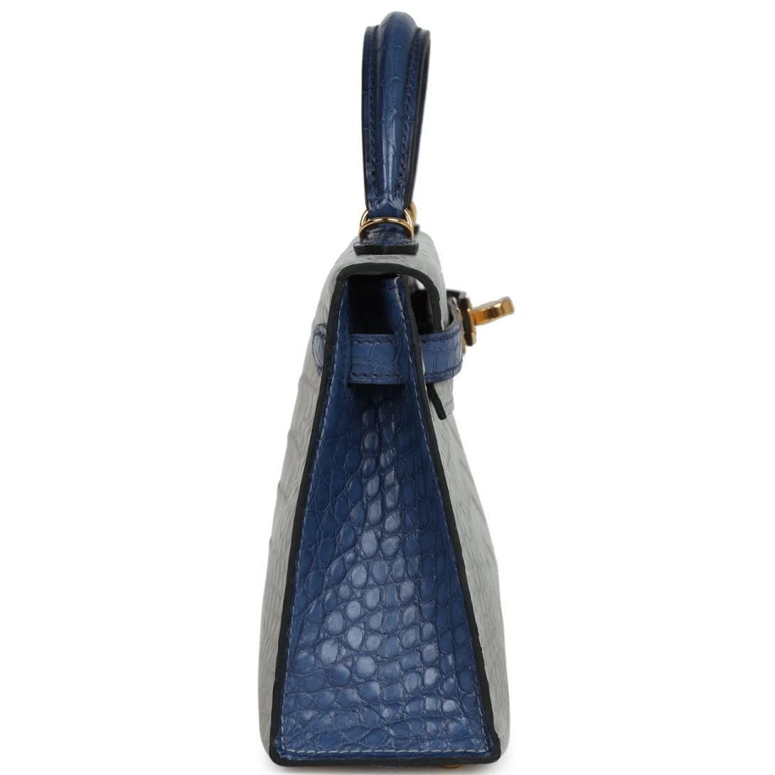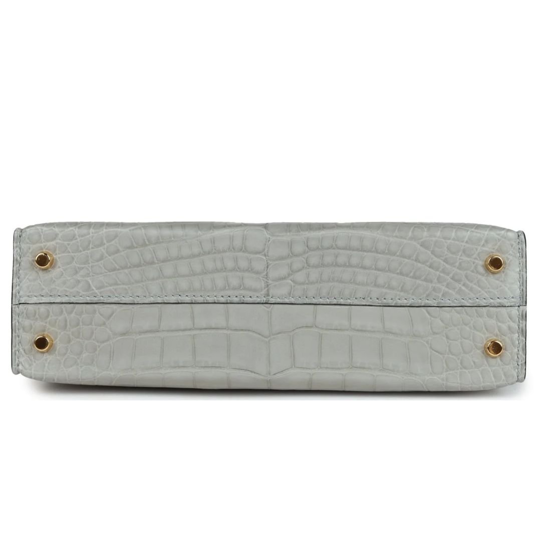 HERMÈS SPECIAL ORDER HSS KELLY SELLIER 20 GRIS PERLE AND BLEU DE MALTE MATTE ALLIGATOR GOLD HARDWARE