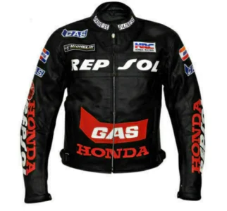 The Honda Repsol Motorbike Racing Leathers jacket is specially designed for professional bikers to fulfill their biking passion on track with great safety. This Jacket features excellent design & comfort, 100% genuine Cowhide leather, internal & external Protectors on the Shoulder, Elbows and Back, and YKK Zippers for Performance.