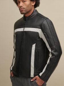 Contrast color blocked leather biker jacket.