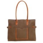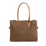 The exterior of the bag showcases a subtle embossed logo, adding a touch of elegance without overwhelming the design. The tote’s sturdy construction and reinforced base provide excellent support, ensuring that the bag retains its shape even when filled.
