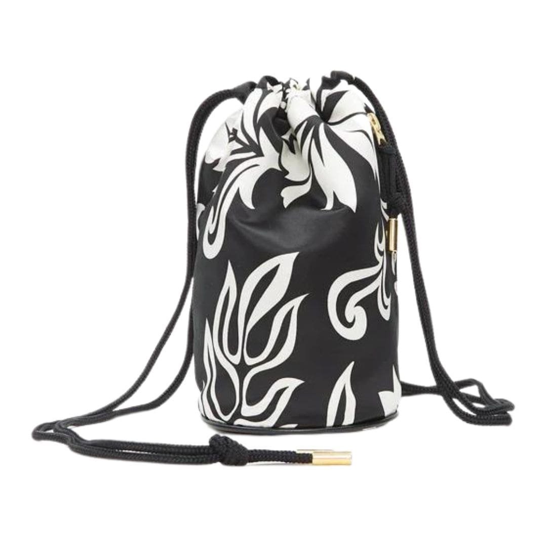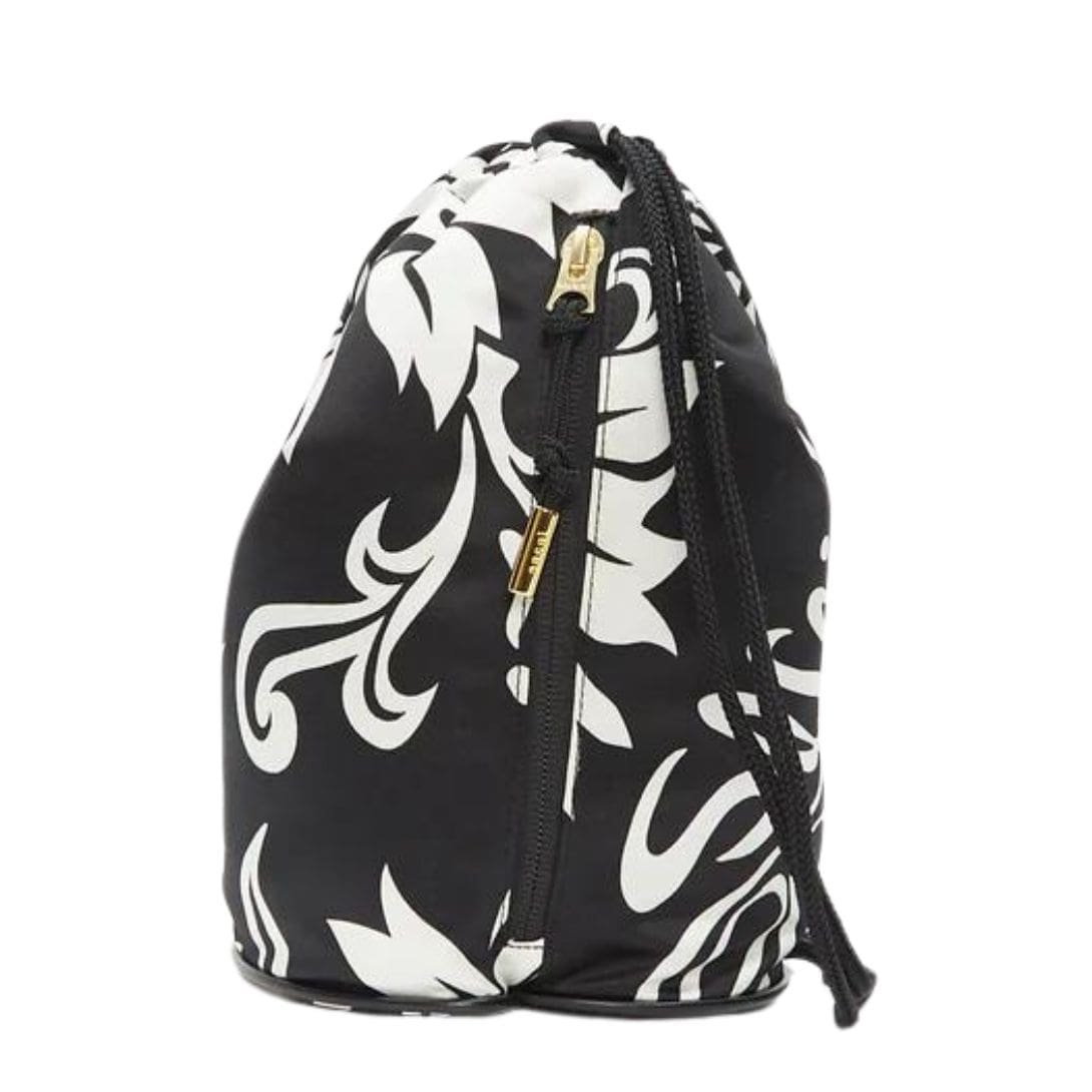 La Garconne Sacai Kinchaku Bag drawstring bag features adjustable shoulder straps and gold-tone metal hardware, crafted from soft taffeta fabric in a floral print. It includes a single front zip pocket, a single interior patch pocket, and an embroidered logo at the base. The bag comes fully lined.