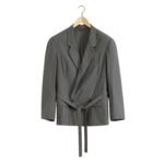 The design features a sleek, tailored silhouette that flatters the body while maintaining a relaxed, yet polished appearance. The belt cinches at the waist, enhancing the jacket’s structured look and allowing for a customizable fit. This detail not only adds a touch of modern flair but also ensures that the jacket can be styled in multiple ways, adapting to different fashion preferences.