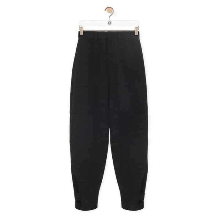 Loewe’s design approach shines through in these cargo trousers with their modern, tailored fit. The traditional cargo silhouette is reimagined with refined details such as sleek, minimalistic pockets and a streamlined leg profile, distinguishing them from conventional designs. The incorporation of these high-quality fabrics not only enhances the visual appeal but also ensures durability and ease of movement, making them a versatile addition to any wardrobe.
