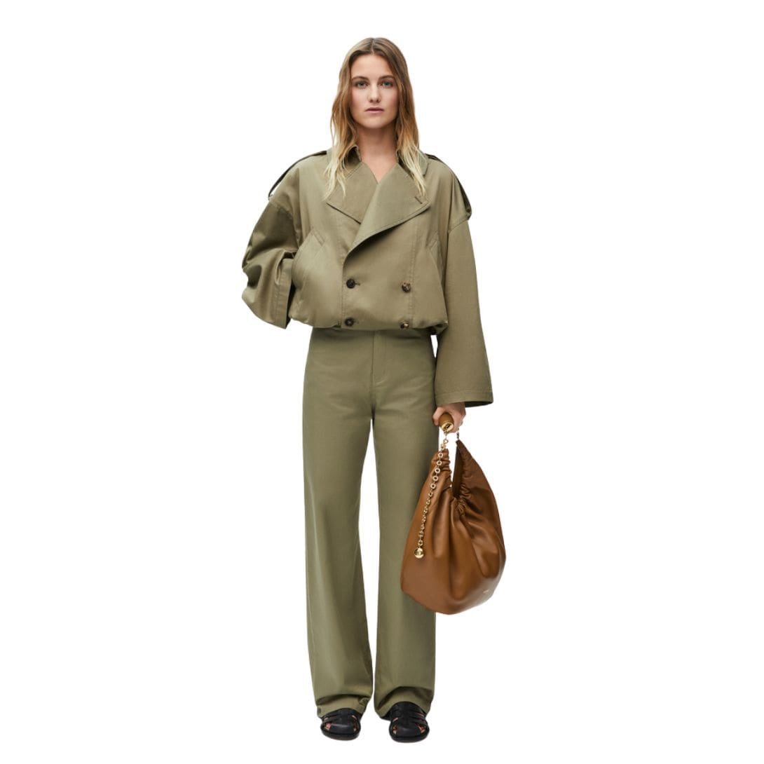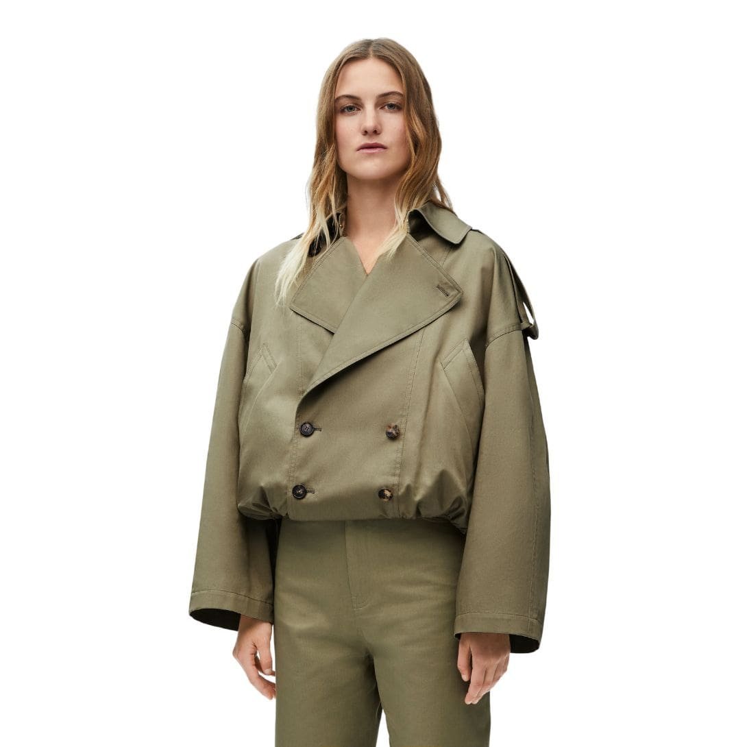 Functionality meets style in this versatile piece. The LOEWE Cotton Balloon Jacket is designed to complement a wide range of outfits. It transitions seamlessly from casual daywear to more refined evening looks. The neutral color palette enhances its adaptability, making it an essential addition to any wardrobe. Whether paired with jeans for a laid-back look or over a dress for a chic ensemble, this jacket adds a touch of avant-garde flair to any outfit.
