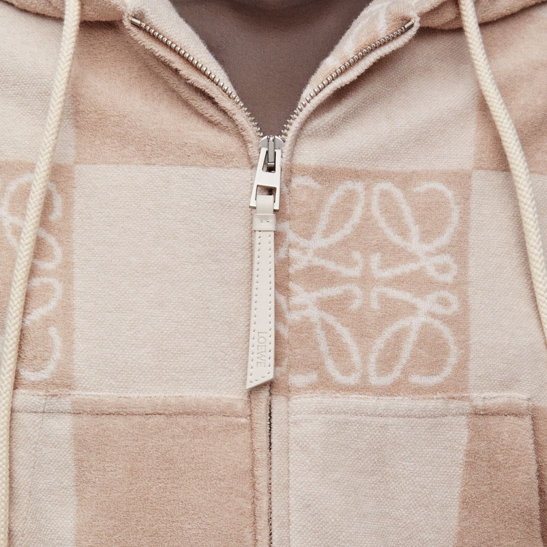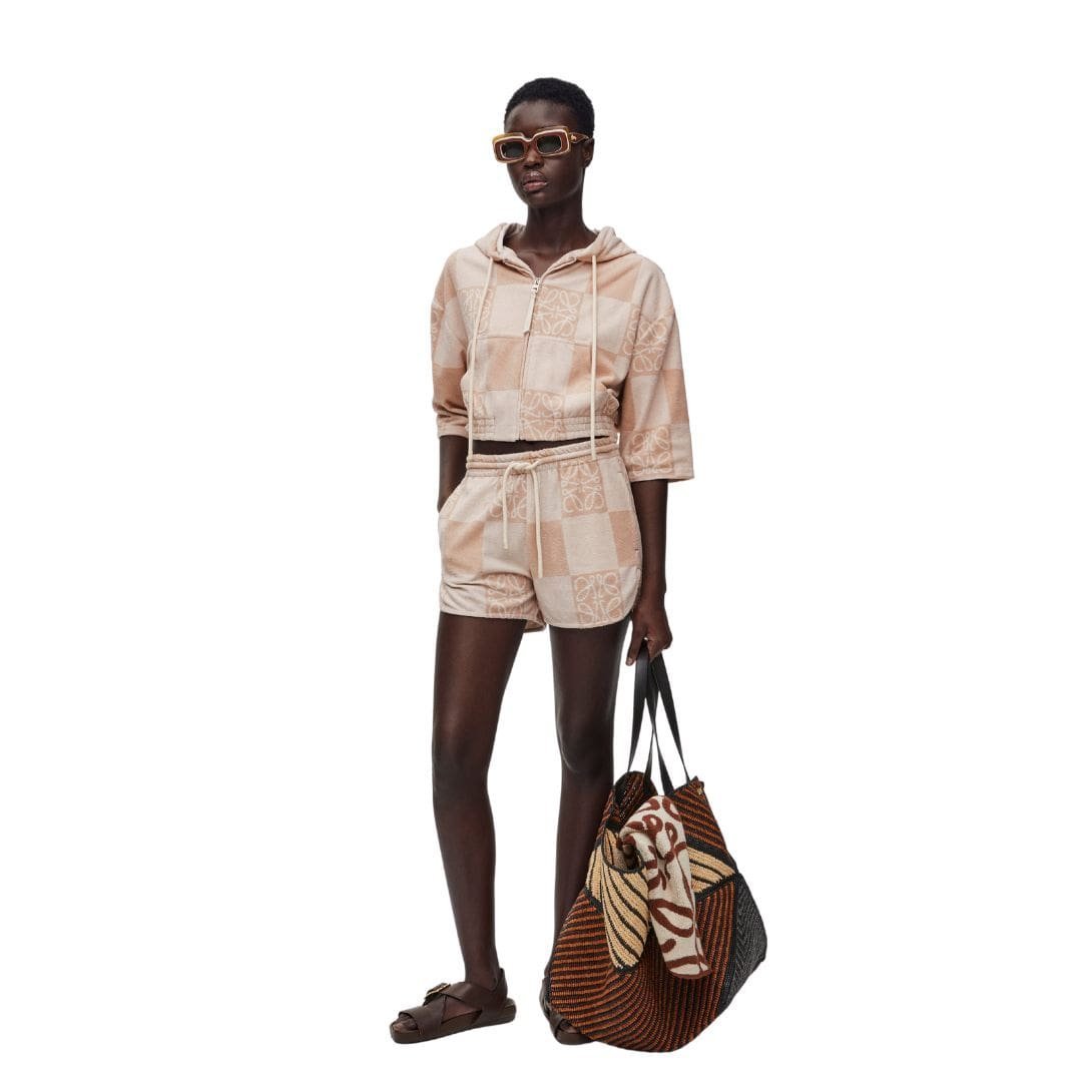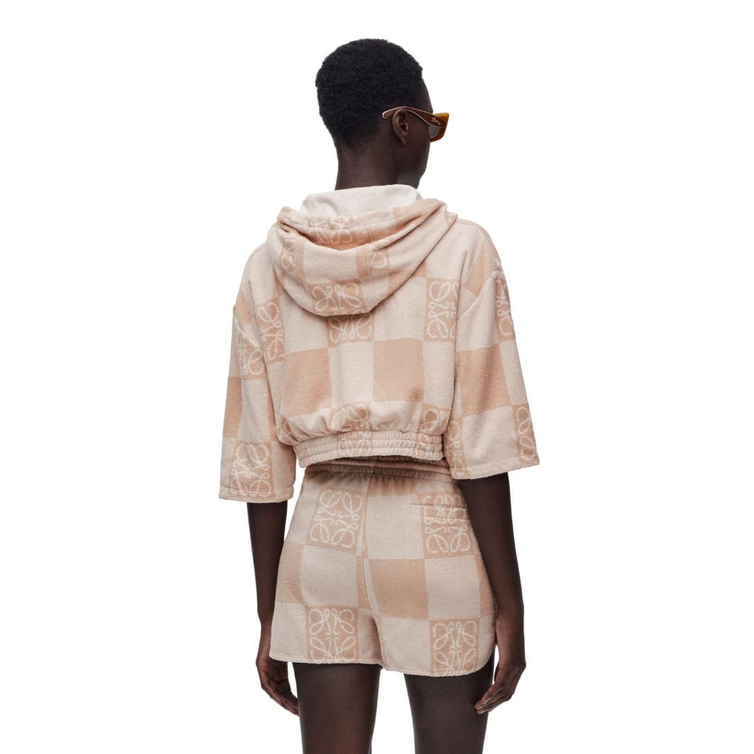 The Loewe cropped hoodie in jacquard cotton terry blends the softness of cotton with the durability of polyester, creating a stylish and functional garment ideal for various occasions.
