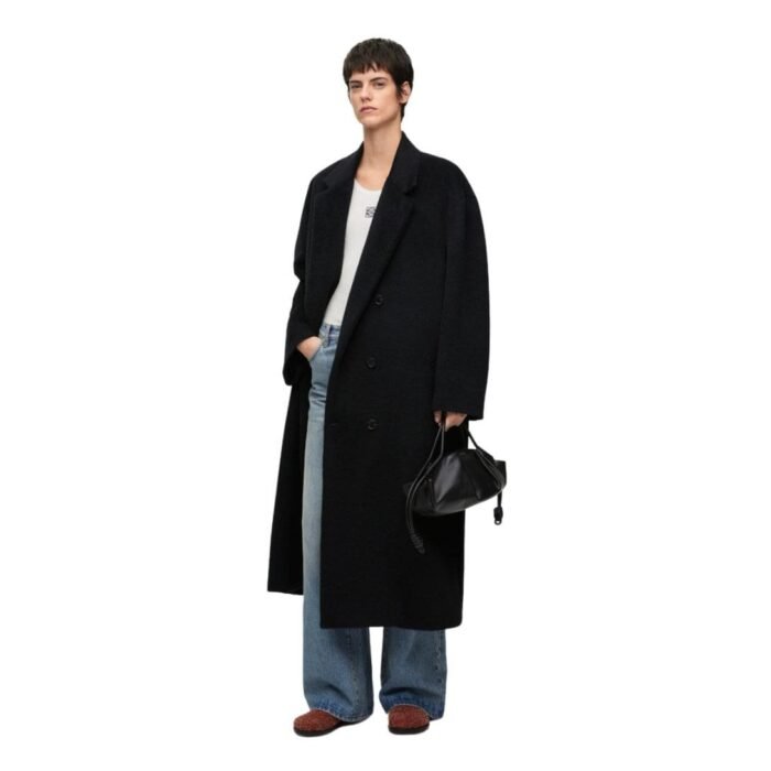 The double-breasted design not only adds a classic touch but also allows for versatility in styling, making it suitable for both formal and casual occasions. The precise craftsmanship is evident in every detail, from the carefully tailored seams to the refined stitching, highlighting Loewe’s dedication to quality.