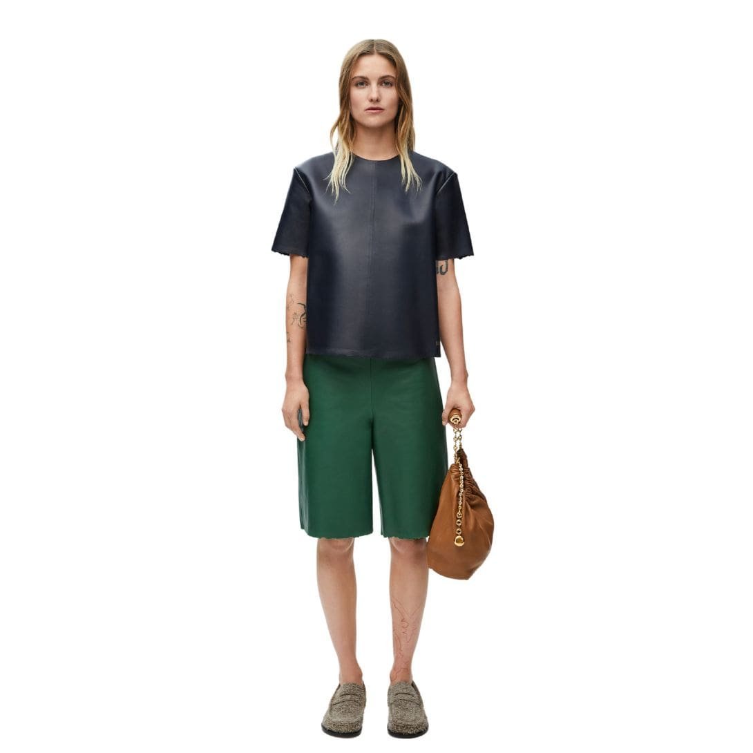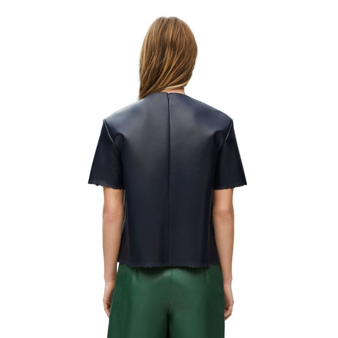 Loewe’s meticulous attention to detail is evident in the craftsmanship of this T-shirt. The precise stitching and high-quality finishes highlight the brand’s commitment to excellence. The simplicity of the design is elevated by the luxurious texture of the nappa leather, which adds a sophisticated touch to the classic T-shirt silhouette. The crew neck and short sleeves maintain a traditional look, while the premium material transforms it into a statement piece.