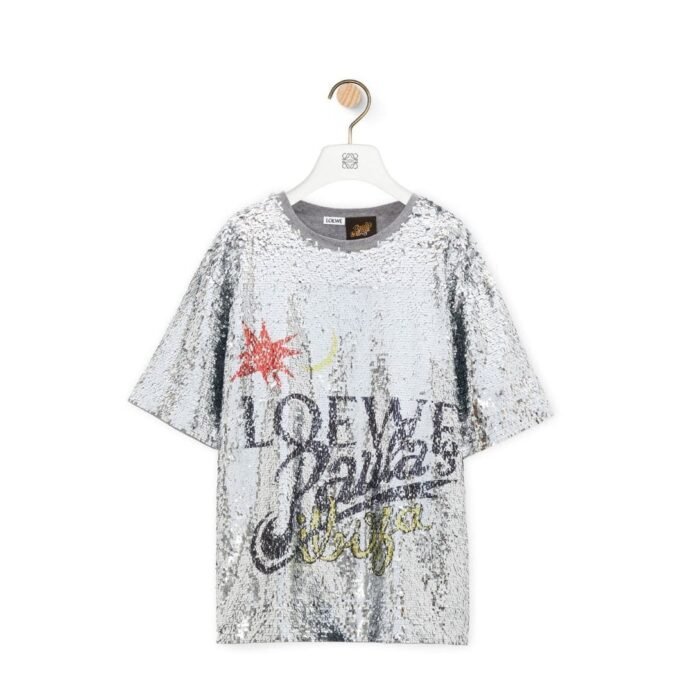 The design of the T-shirt remains true to Loewe’s aesthetic, with clean lines and a minimalist approach that allows the sequins to take center stage. The round neckline and short sleeves maintain the classic T-shirt shape, while the loose fit provides a modern, relaxed feel. The hemline falls at a flattering length, making it versatile enough to be paired with a variety of bottoms, from jeans and skirts to tailored trousers. LOEWE LOOSE FIT T SHIRT IN SEQUINS