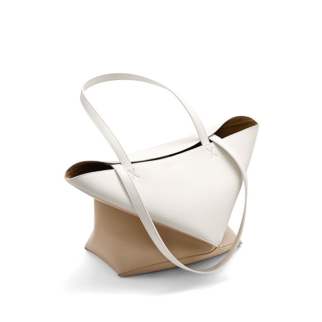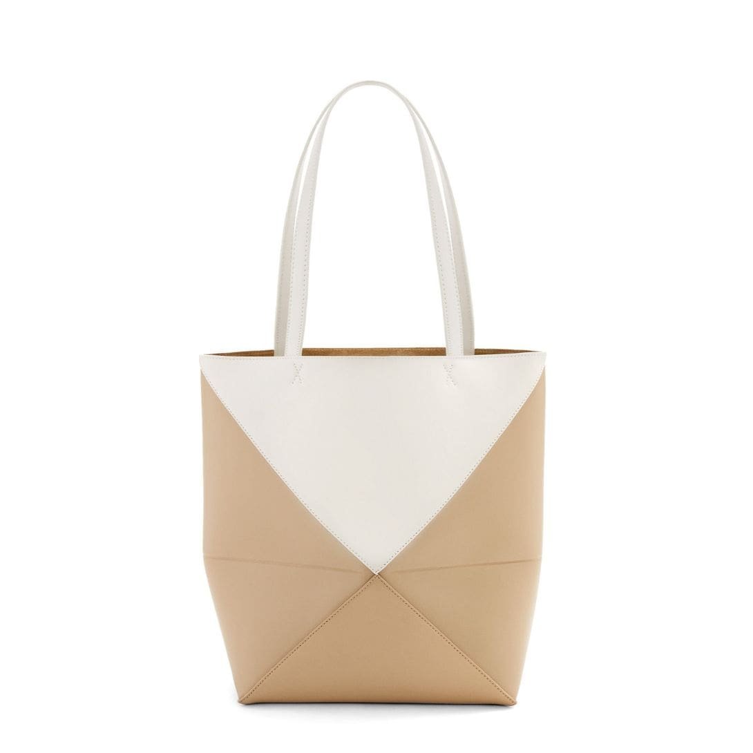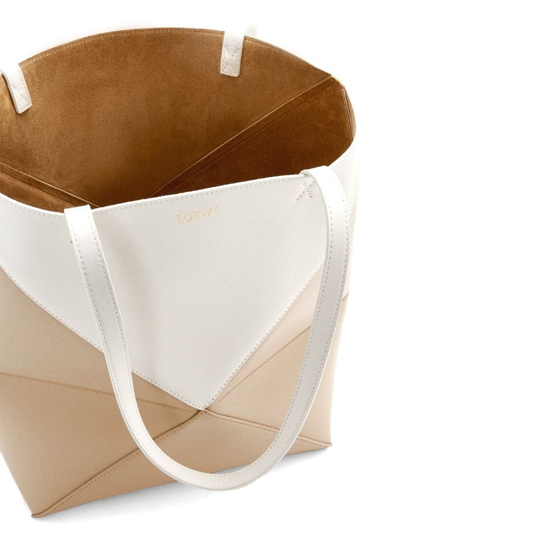 Indulge in luxury with the exquisite craftsmanship of the LOEWE Puzzle Fold Tote Bag In Shiny Calfskin, crafted from polished calf leather. This sophisticated accessory is both timeless and versatile, embodying the epitome of elegance.