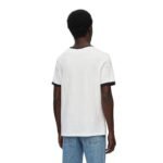 The silhouette of the t-shirt is tailored to a slim fit, offering a sleek and modern appearance that flatters the body without being overly tight. This fit makes it versatile, suitable for both casual and semi-formal occasions, allowing it to seamlessly transition from day to evening wear.