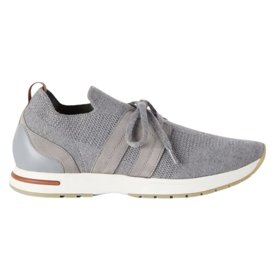 The white rubber sole is designed for lightness and durability, featuring kummel-colored inserts and a tread with the Loro Piana initials. This ultra-light technical sole enhances mobility, making the sneakers perfect for all-day wear.