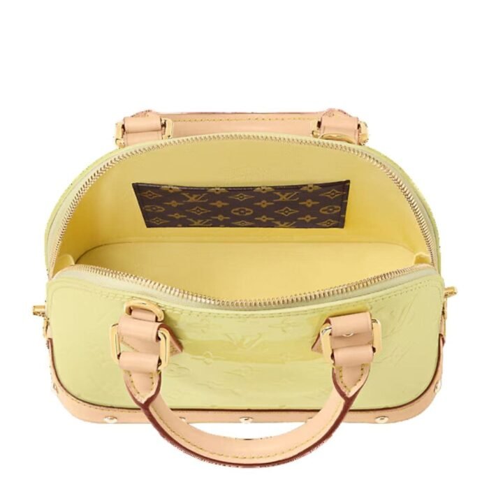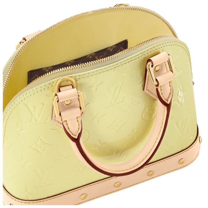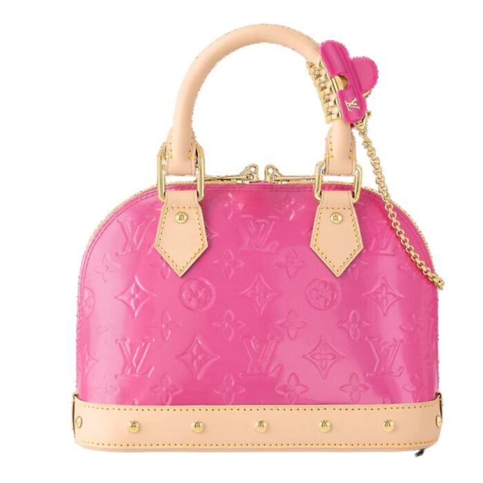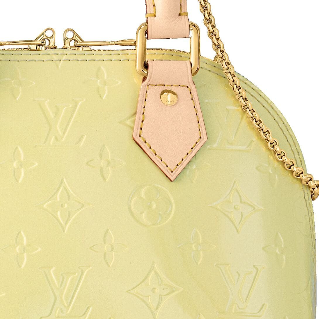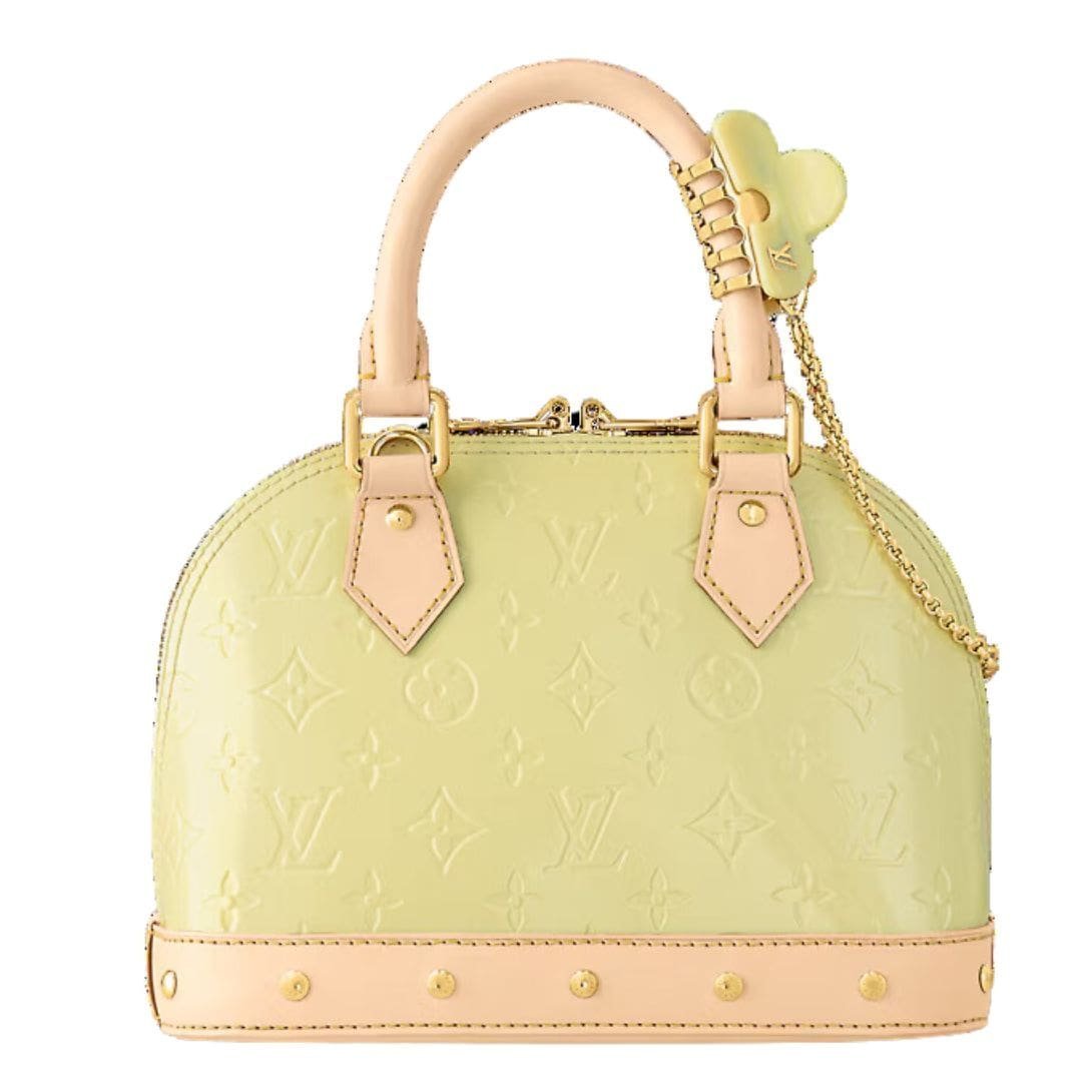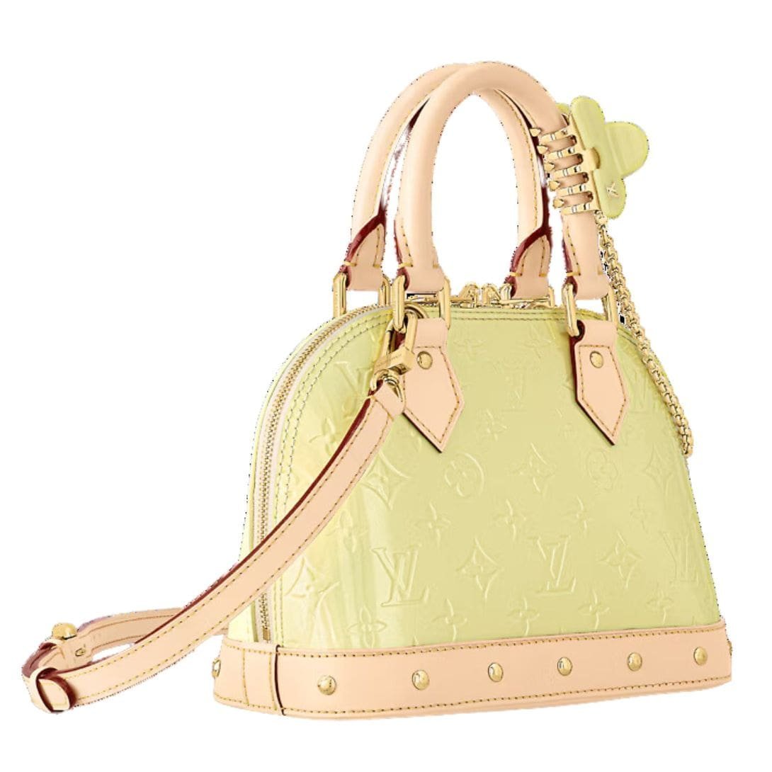 Presenting the LOUIS VUITTON ALMA BB, a timeless icon reimagined in lustrous Monogram Vernis leather, adorned with natural cowhide-leather accents along the top handle and bottom trim. The distinctive Art Deco silhouette of the Alma BB is elevated with a pastel colorway and golden rivets on the handle mounts and bottom leather trim, exuding an on-trend allure. Each bag is accompanied by a matching-colored hair clip, adding a touch of charm to every ensemble.