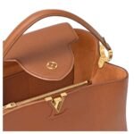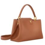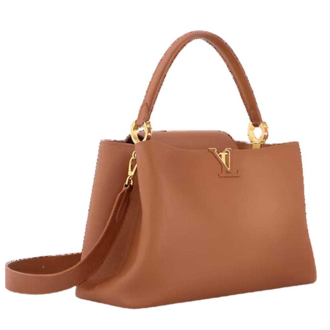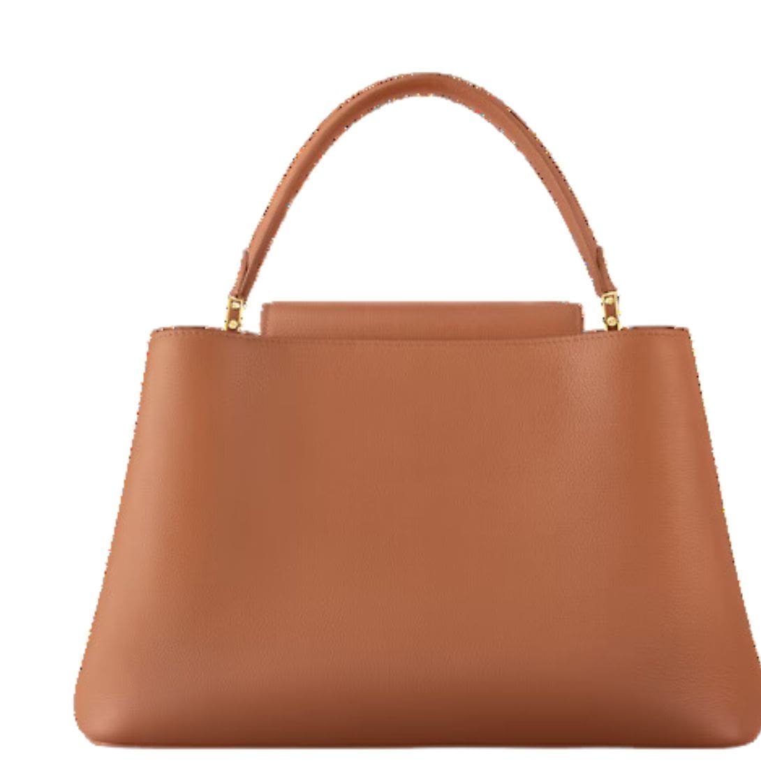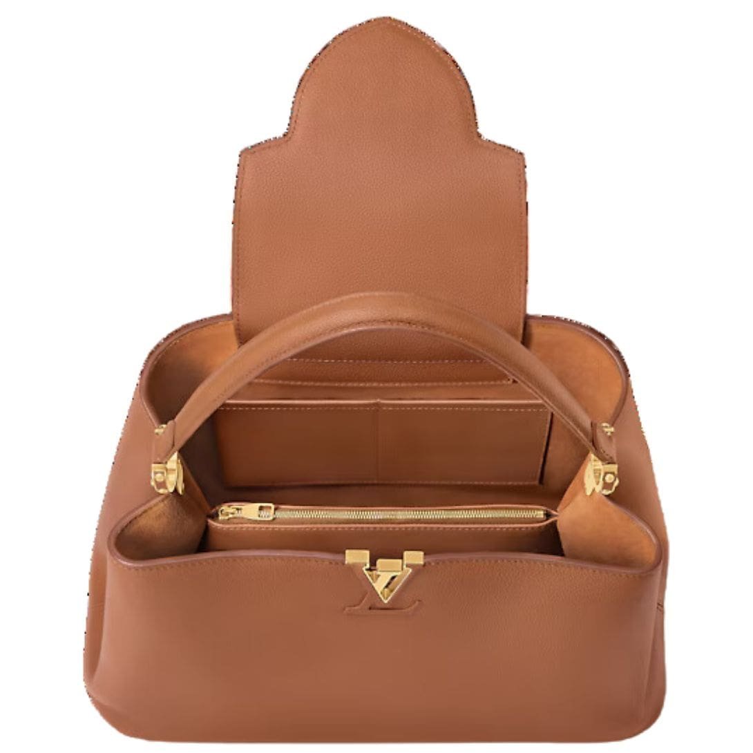 Measuring 15 x 9.1 x 6.3 inches, this LOUIS VUITTON CAPUCIINES GM SOUPLE bag in elegant Cognac is adorned with smooth and grained calfskin trim, accentuated by lustrous gold-color hardware, adding a touch of opulence to its understated allure. The double carry style allows you to wear it with the flap inside or outside, providing versatility to suit your preference.
