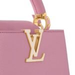 Indulge in luxury with the LOUIS VUITTON CAPUCINES MINI handbag crafted from exquisite Taurillon leather, renowned for its durability and supple texture. Standing as a symbol of timeless elegance, this handbag features the iconic Monogram Flower in golden metal and enamel, adorning the top handle, while the LV Initials shimmer with enamel inset. The sophisticated Marshmallow Pink hue adds a touch of femininity to its allure.