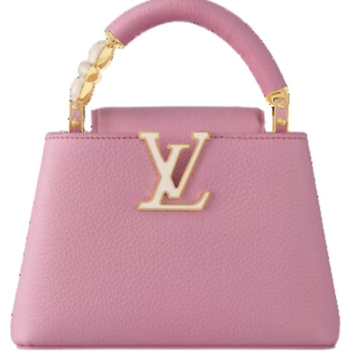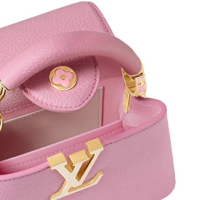 Indulge in luxury with the LOUIS VUITTON CAPUCINES MINI handbag crafted from exquisite Taurillon leather, renowned for its durability and supple texture. Standing as a symbol of timeless elegance, this handbag features the iconic Monogram Flower in golden metal and enamel, adorning the top handle, while the LV Initials shimmer with enamel inset. The sophisticated Marshmallow Pink hue adds a touch of femininity to its allure.