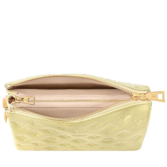 Introducing the LOUIS VUITTON COUSSIN BB in a delightful new hue, Chic & Yellow, with a lustrous finish that adds a touch of glamour to any ensemble. Crafted in puffy varnished calfskin, this compact yet statement-making bag is adorned with embossed Monogram motifs, lending a tactile flair to its design.