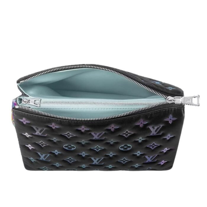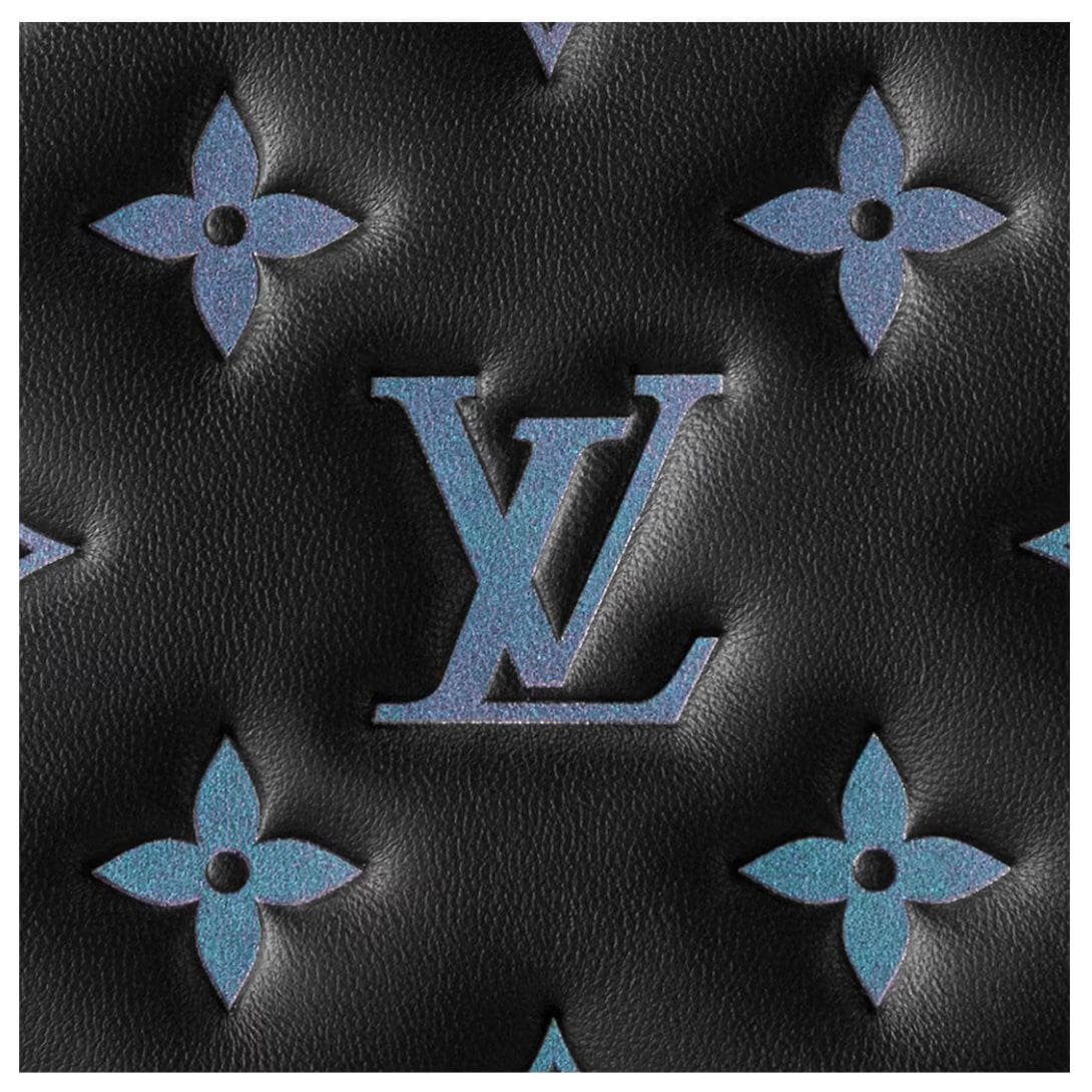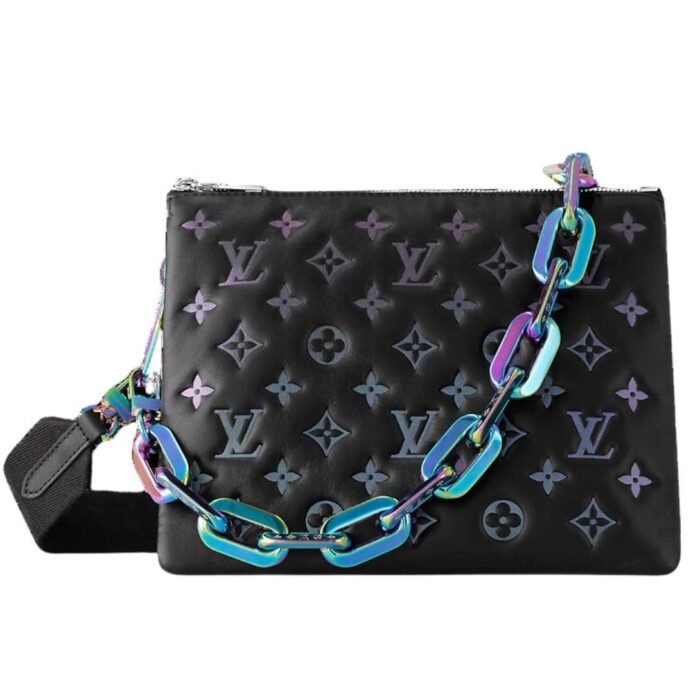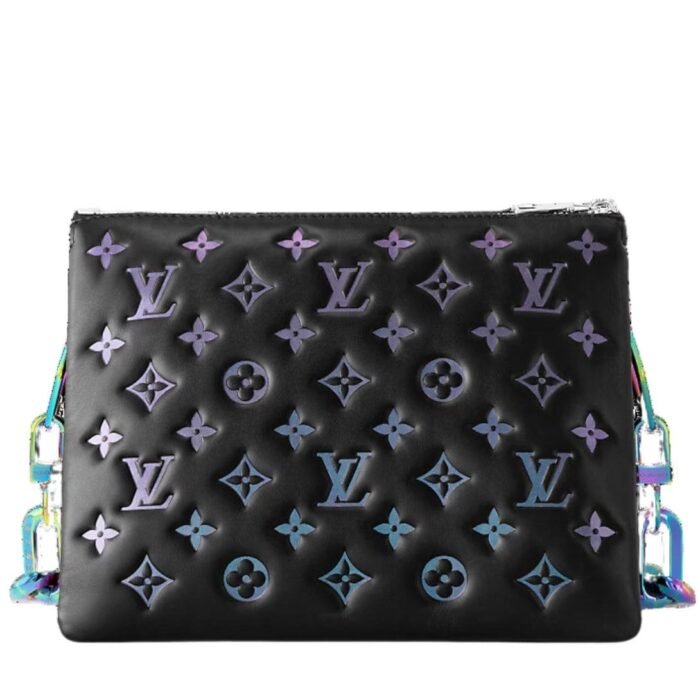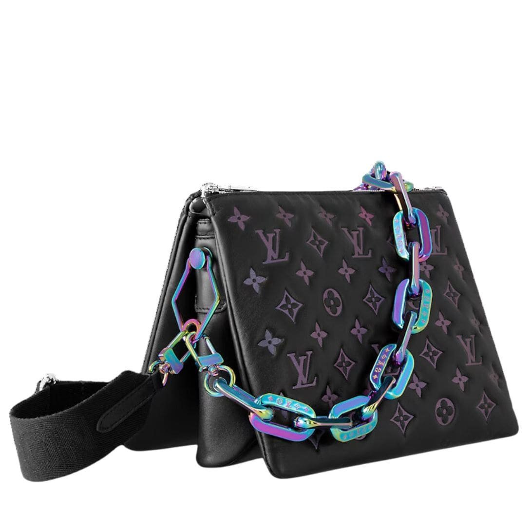 Measuring 10.2 x 7.9 x 4.7 inches, the LOUIS VUITTON COUSSIN PM exudes understated glamour in classic black, enhanced by calf-leather trim and opulent gold-color hardware adorned with shaded iridescent colors. Experience the magic as the iridescent finish transforms from a radiant yellow hue to subtle shades of blue, depending on the light, captivating attention with every movement.