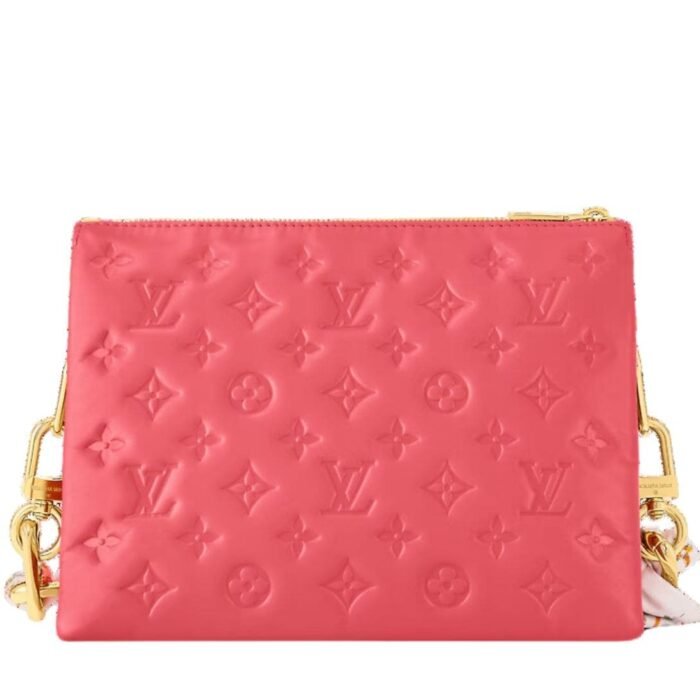 Embrace the essence of spring with the LOUIS VUITTON COUSSIN PM, a vibrant expression of style and sophistication. Crafted from luxurious lambskin adorned with iconic Monogram motifs, this edition radiates joy with its playful colorway. A delicate silk scarf, intricately braided through the links of the bag’s engraved chunky chain, adds a feminine touch to its design.