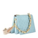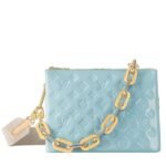 Introducing the LOUIS VUITTON COUSSIN PM handbag, a stunning piece crafted from puffy varnished calfskin embossed with iconic Monogram motifs, radiating elegance and sophistication. The chic, shimmery finish of the leather adds a touch of glamour to its timeless design, while the golden links of the chain straps create a striking contrast with blue resin inserts, offering a desirable new hue for the season.