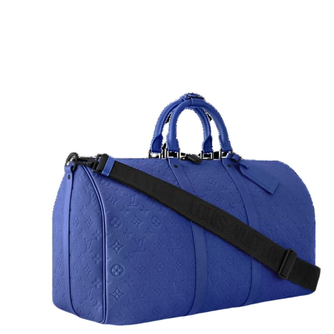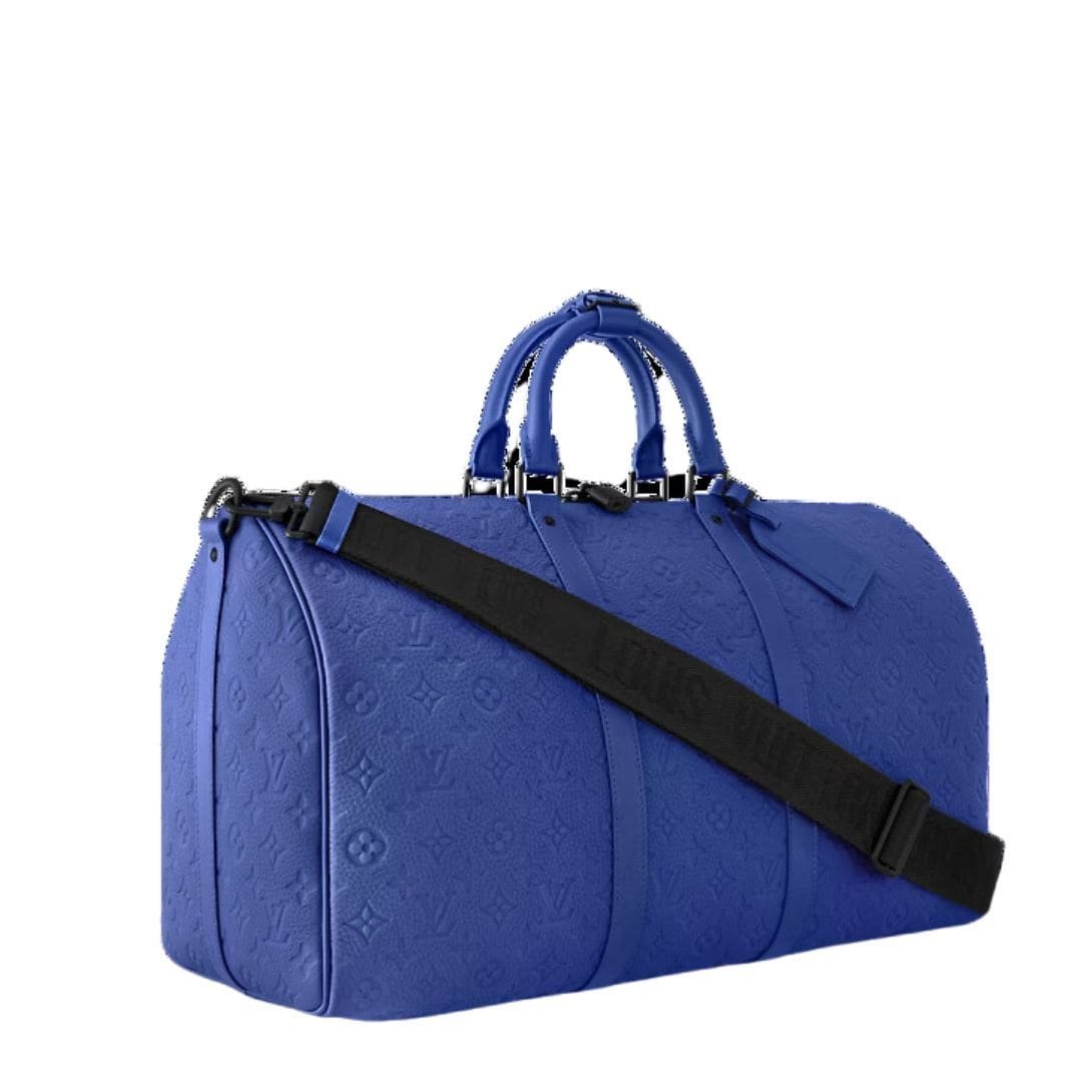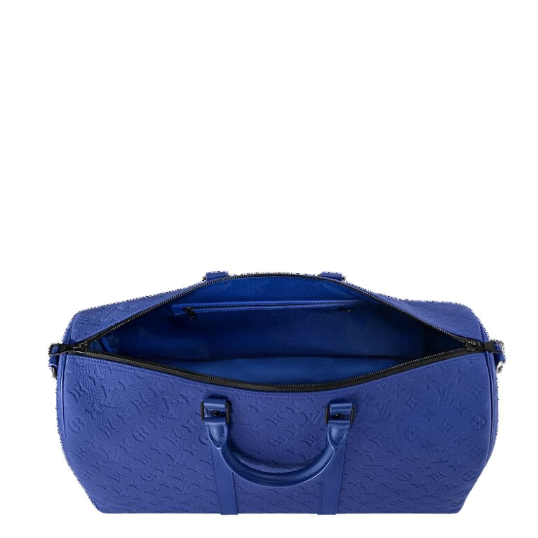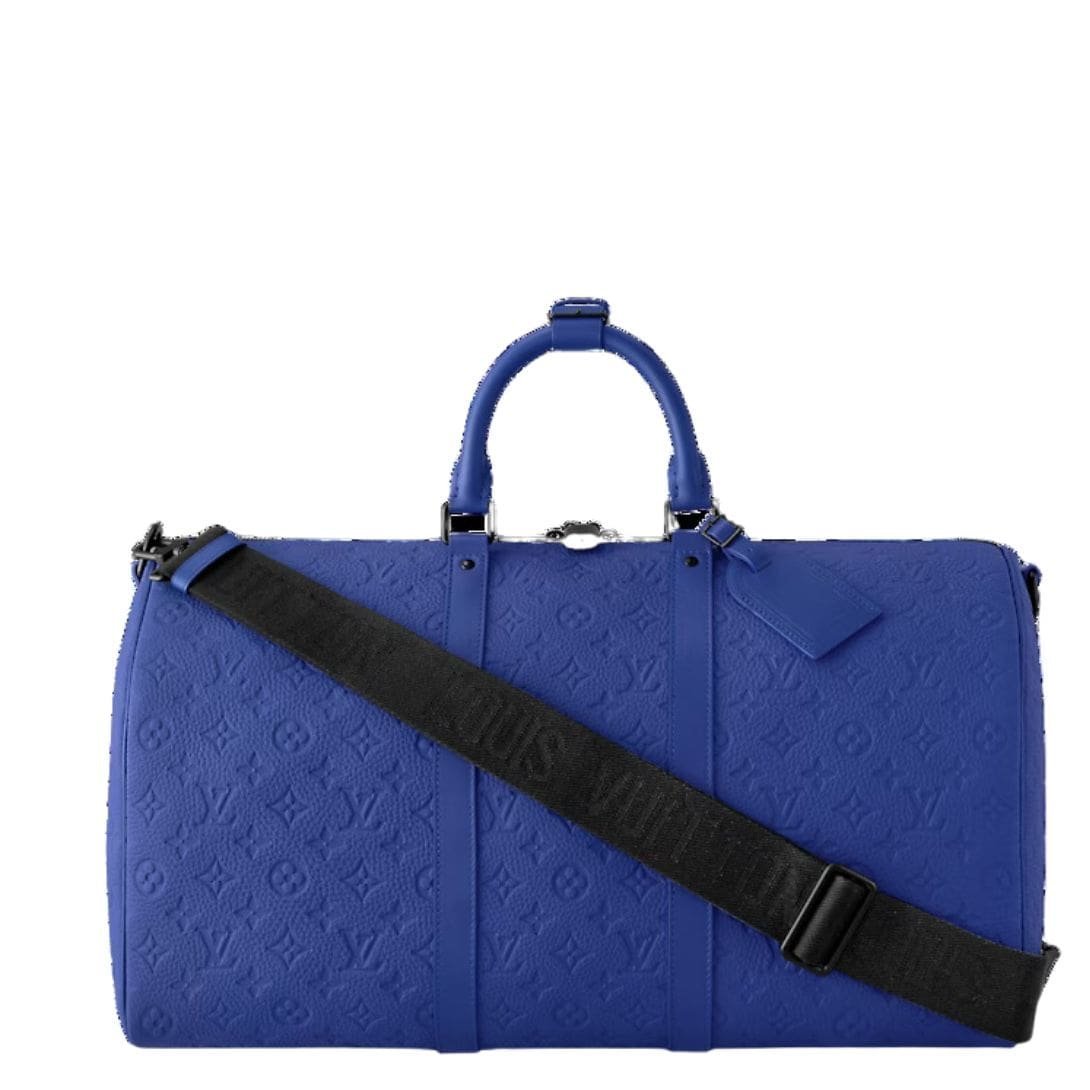 Introducing the LOUIS VUITTON KEEPALL BANDOULIERE 50, a timeless travel companion exuding masculine elegance in Taurillon embossed leather. Crafted with precision, its design features tone-on-tone cowhide leather bands, rolled top handles, and discreet embossed LVs and Monogram Flowers, reflecting Louis Vuitton’s iconic style.