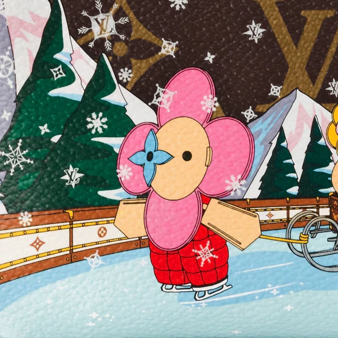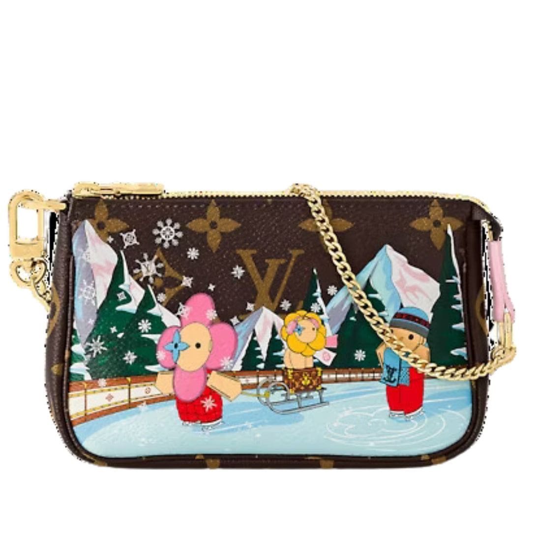 Introducing the LOUIS VUITTON MINI POCHETTE ACCESSORIES for Winter 2023, a charming creation from Louis Vuitton adorned with an exclusive print featuring the beloved House mascot, Vivienne, and her friends gracefully ice skating amidst a picturesque wintery landscape of fir trees and snowy mountains. Crafted from iconic Monogram canvas, this miniature pouch captures the essence of the season with its whimsical design, making it a delightful collector’s item or a thoughtful gift.