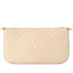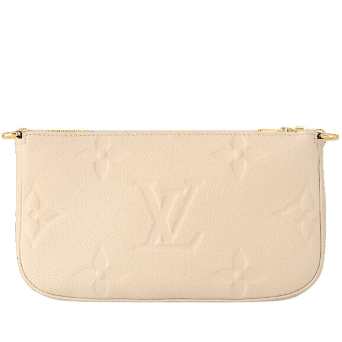 Introducing the LOUIS VUITTON MULTI POCHETTE ACCESSOIRES handbag, a versatile masterpiece crafted from cream-colored Monogram Empreinte leather. This unique bag comprises two pouches seamlessly attached, offering both functionality and style. Lined with matching cream-color microfiber, the larger pouch features an inside flat pocket for added organization.