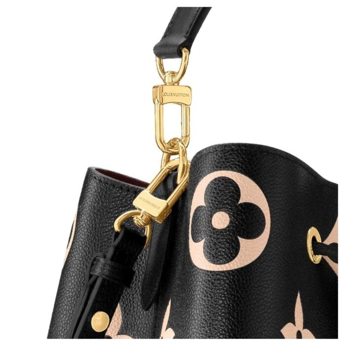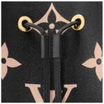 Measuring 10.2 x 10.2 x 6.9 inches, the LOUIS VUITTON NEONOE MM epitomizes versatility and functionality in classic black/beige, complemented by grained cowhide-leather trim and gold-color hardware that adds a touch of luxury to the design. The microfiber lining enhances its refined aesthetic, while the metal eyelets add a hint of modernity to the overall look.