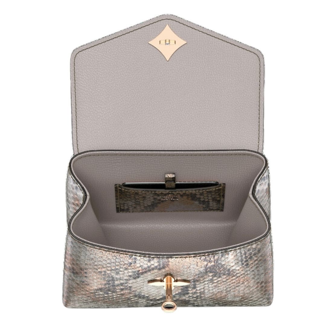 Boasting python leather construction with delicate python trim and a sumptuous goatskin lining, this handbag is adorned with exquisite pink gold hardware, adding a touch of refinement to its allure. The versatile design offers multiple carrying options, with a chic python leather strap for shoulder or crossbody wear, alongside a convenient top handle for effortless elegance.
