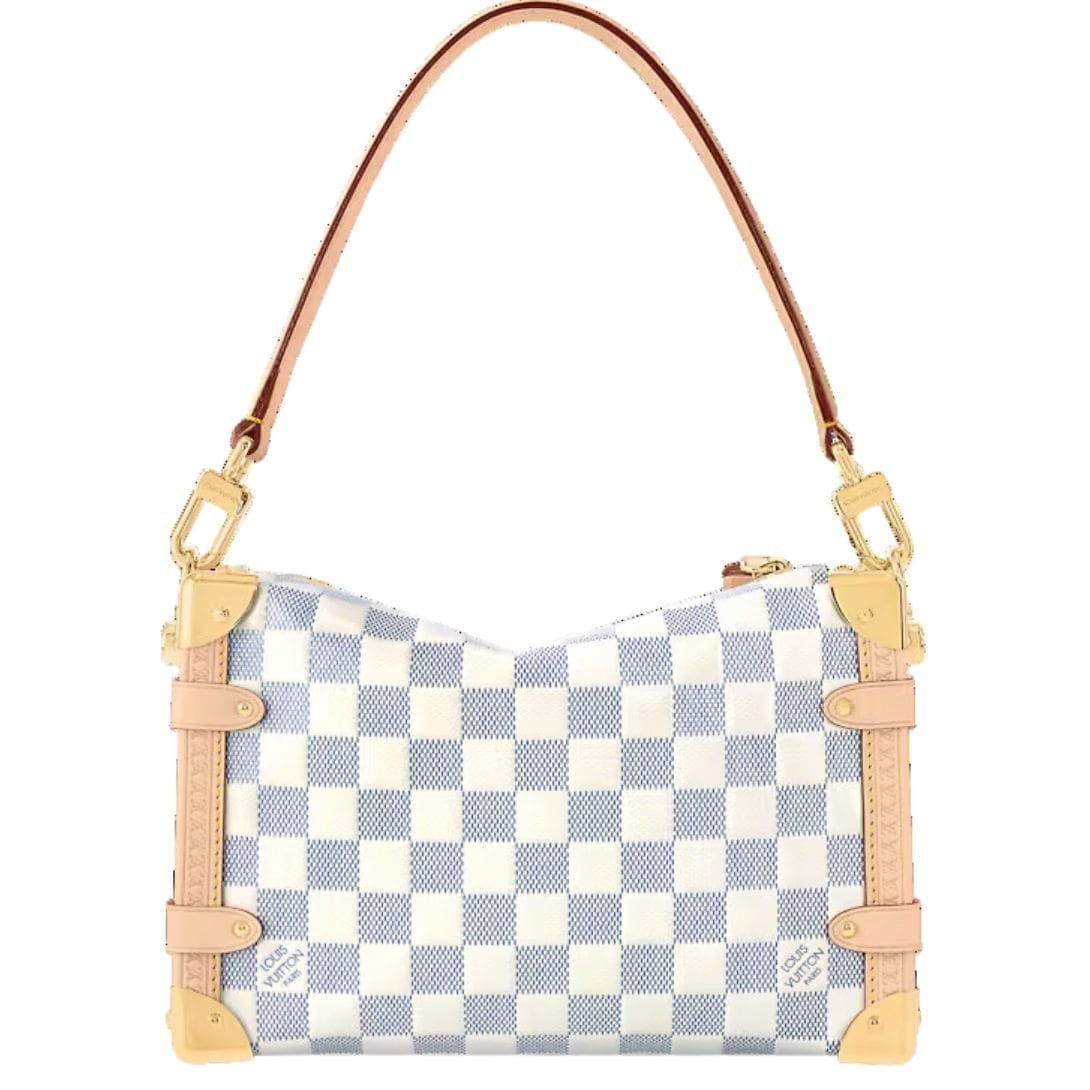 Experience the whimsical elegance of Nicolas Ghesquière’s Side LOUIS VUITTON SIDE TRUNK MM , now presented in a charming Celeste Blue hue and adorned with luxurious Damier Vernis calfskin and natural cowhide trim. This playful reinterpretation of a Louis Vuitton classic embodies creativity and sophistication, perfect for the modern fashion enthusiast.