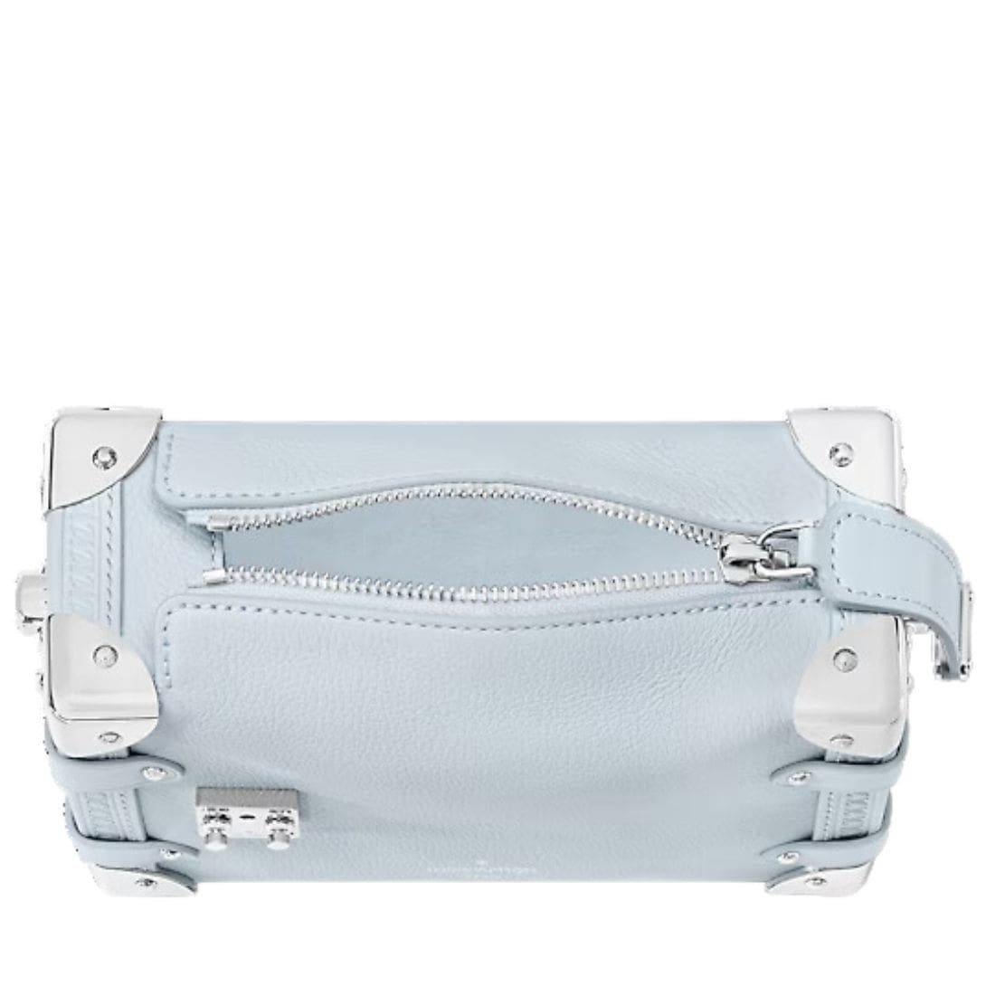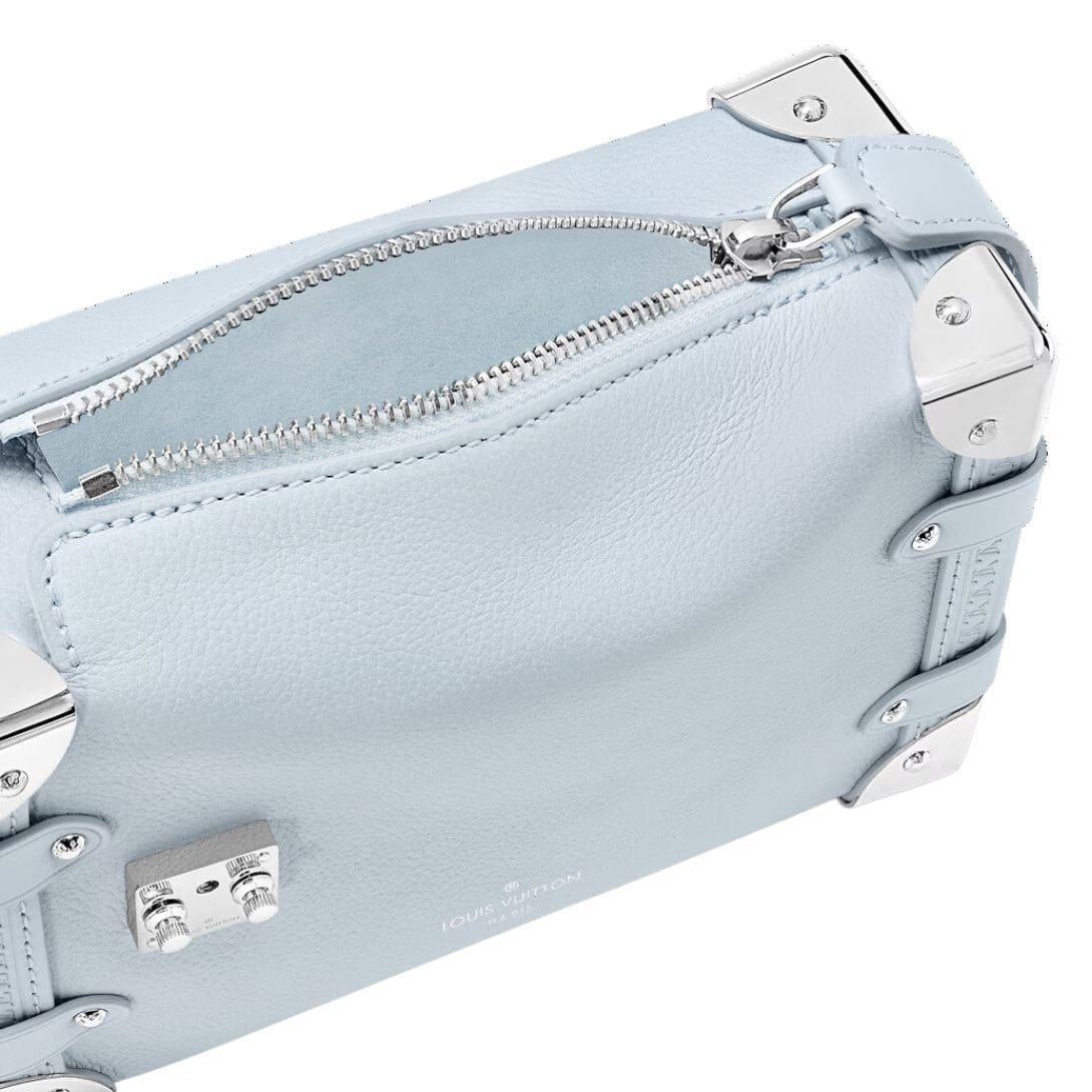 Introducing the LOUIS VUITTON SIDE TRUNK PM, a tribute to Louis Vuitton’s iconic vintage trunks, reimagined in a modern silhouette crafted from luxurious grained calfskin leather. Inspired by heritage design elements, this compact accessory features a silver-color S-lock and corners, adding a touch of sophistication to its Olympe Blue exterior.