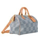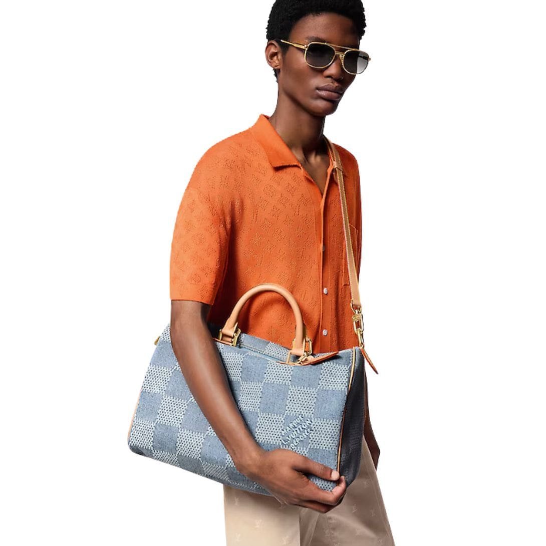 Introducing the LOUIS VUITTON SPEEDY 40 BANDOULIERE , a standout piece from Pharrell Williams’ debut Ready-to-Wear collection for Spring-Summer 2024. This iconic Louis Vuitton bag is reimagined in Damier Denim 3D cotton canvas, infusing it with a fresh, summery aesthetic. The GOTS-certified cotton canvas, in a rich denim-blue, is complemented by natural cowhide leather handles and a removable strap, creating a harmonious blend of luxury and eco-conscious design.