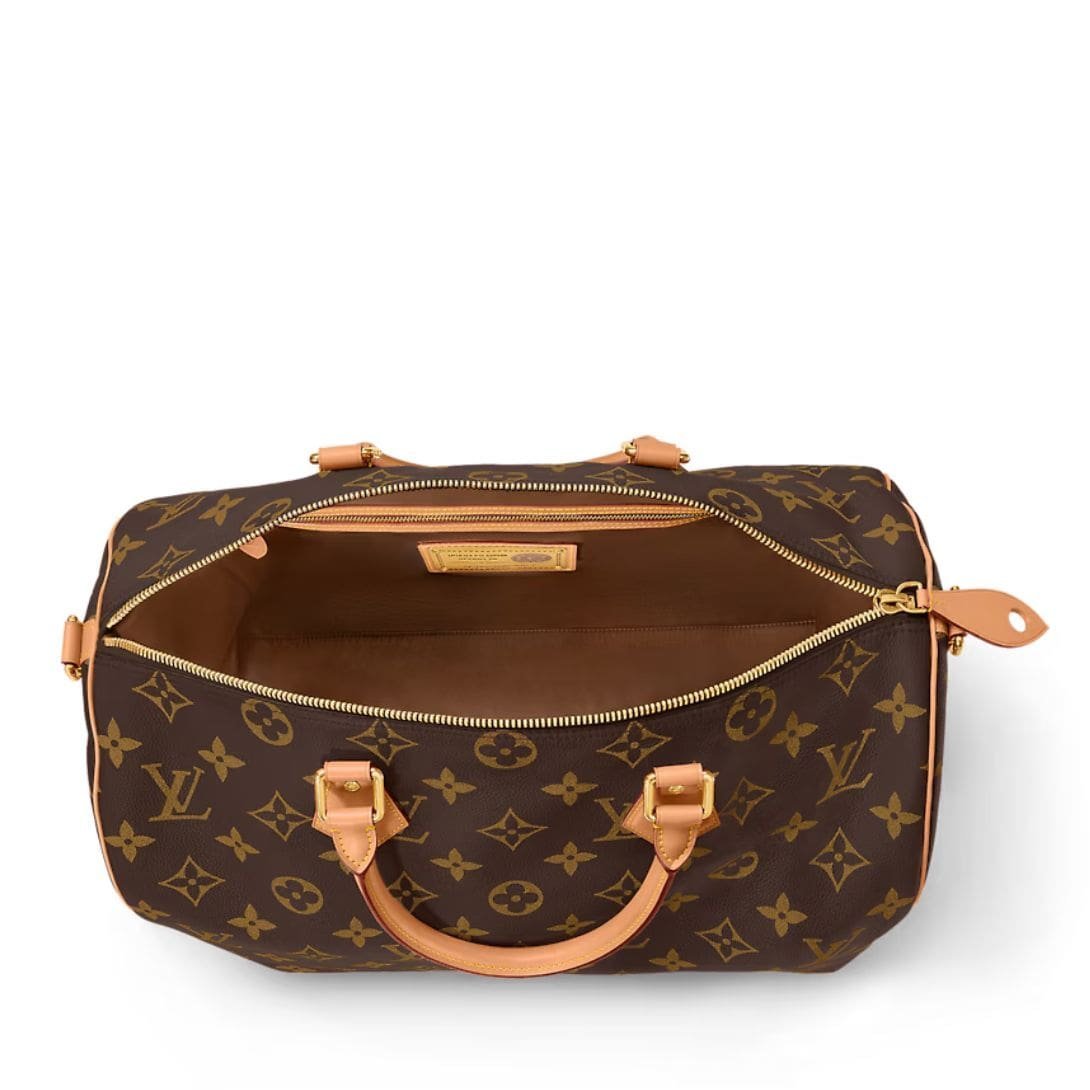 Versatility is key with the LOUIS VUITTON SPEEDY P9 BAND0ULIERE 50, as it features a removable and adjustable strap with a drop length ranging from 15.7 inches to 21.7 inches, along with double handles for multiple carrying options.