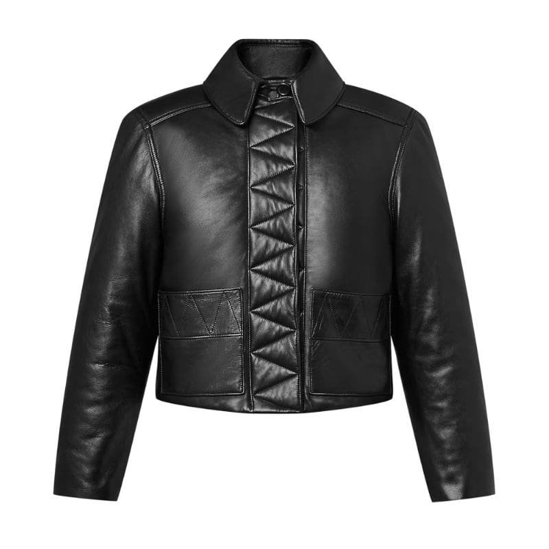 In summary, the Louis Vuitton Topstitched Leather Boxy Biker Jacket is a must-have statement piece that seamlessly combines sophistication with a hint of rebellion. Crafted from luxurious lambskin and adorned with signature topstitching, it exudes effortless style and attitude, making it the perfect addition to any fashion-forward wardrobe.