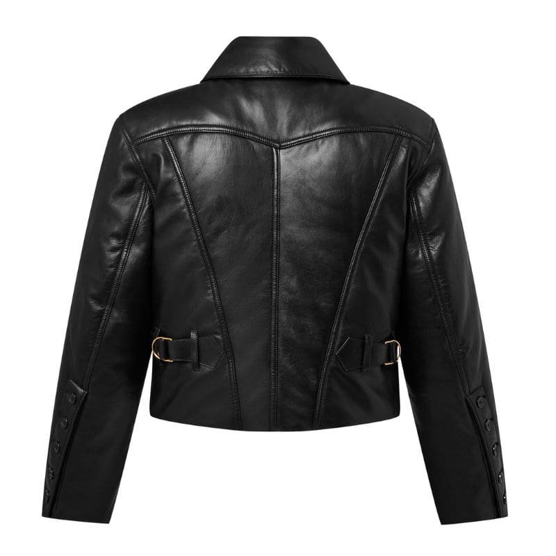 Complete with adjustable buckle details at the back, this jacket exudes a rebellious biker feel, adding an element of attitude to any ensemble. Whether worn over a simple tee and jeans for a casual day out or layered over a dress for a night on the town, it effortlessly elevates any look with its sleek silhouette and edgy detailing.