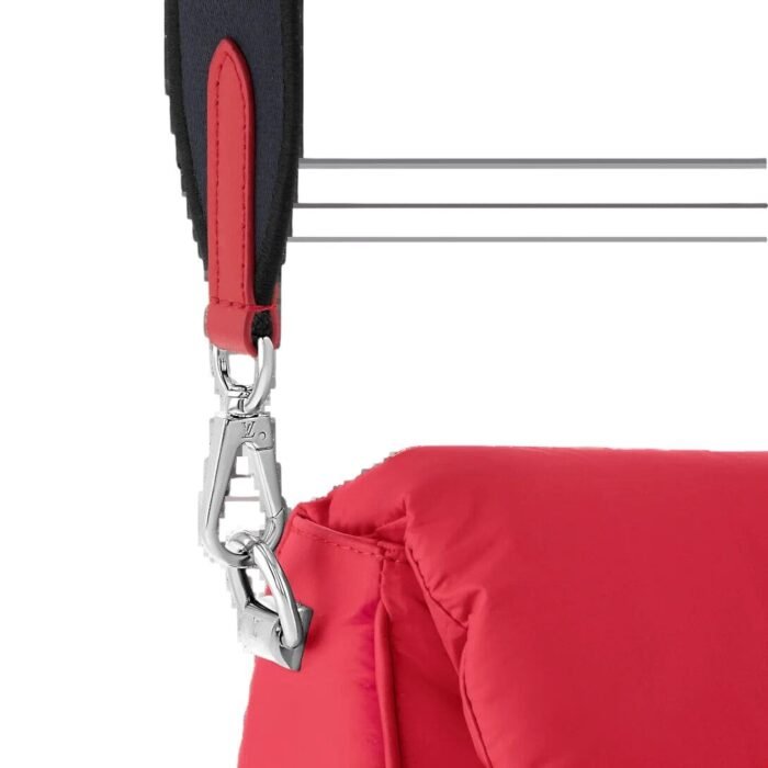 The Twist PM handbag from Louis Vuitton is an exquisite blend of style and sustainability. Crafted from vibrant red padded recycled ECONYL® nylon, this handbag is reminiscent of a classic ski jacket, offering both fashion and functionality. The innovative design includes a wide, removable textile strap adorned with Monogram-Flower ski patterns on one side and a sporty “Vuitton” signature on the other, as well as a detachable chunky chain, providing versatile carrying options.
