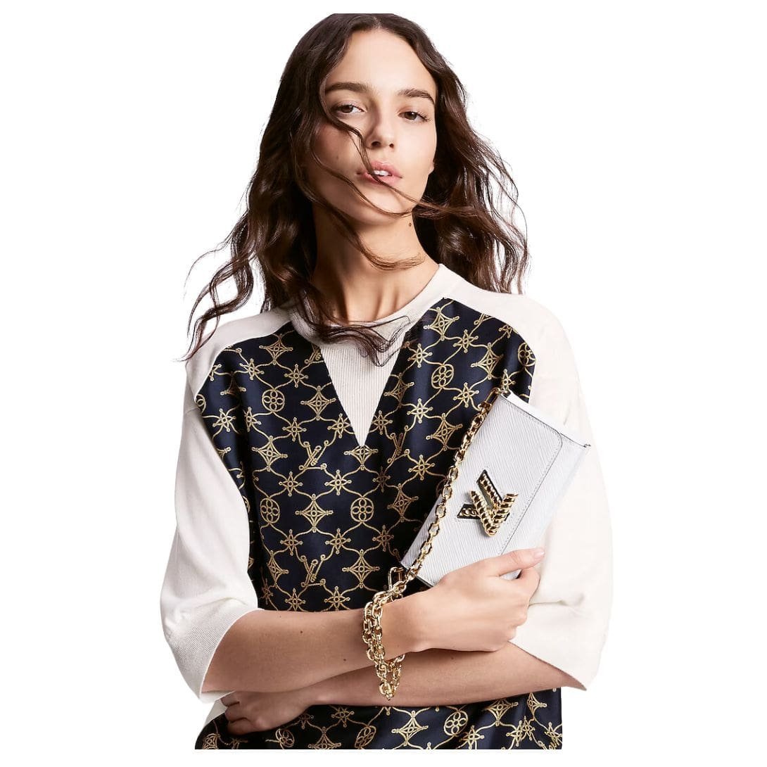 Measuring 7.5 x 4.1 x 2.6 inches, the Twist West Pochette features a pristine white hue that adds a fresh and contemporary touch to any ensemble. The rich texture of the Epi-grained cowhide leather is complemented by gold-color hardware, including the striking LV Twist lock adorned with a nautical rope-like motif, adding a touch of maritime-inspired elegance.