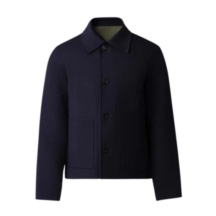 Introducing The Mackage Anders 2-In-1 Reversible Double-Face Wool Jacket is a handmade double-face wool jacket featuring versatile 2-in-1 reversible styling. Designed with a regular fit, one side showcases patch pockets at the waist with visible stitch-through detailing from the reverse side’s twill patch pockets. The spread collar and single-breasted button closure enhance its workwear-inspired look. This jacket is a perfect trans-seasonal piece, combining functionality and style.