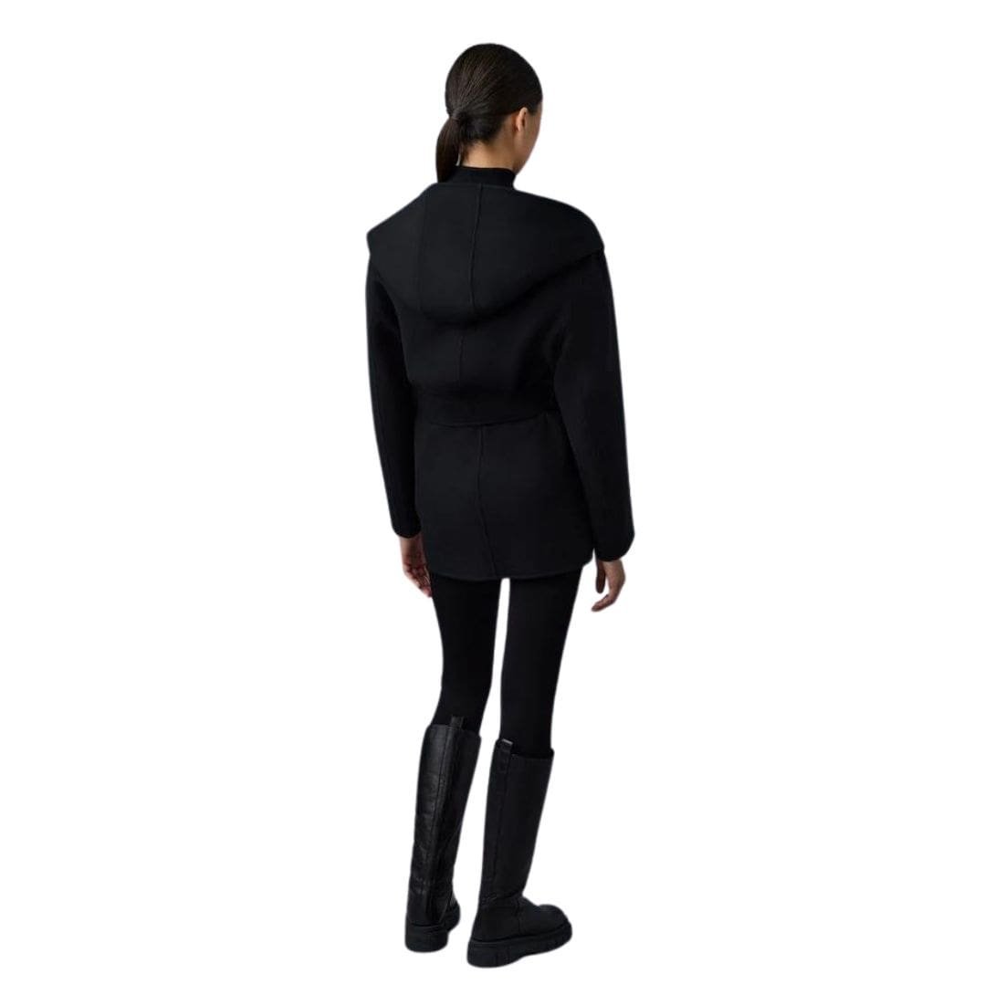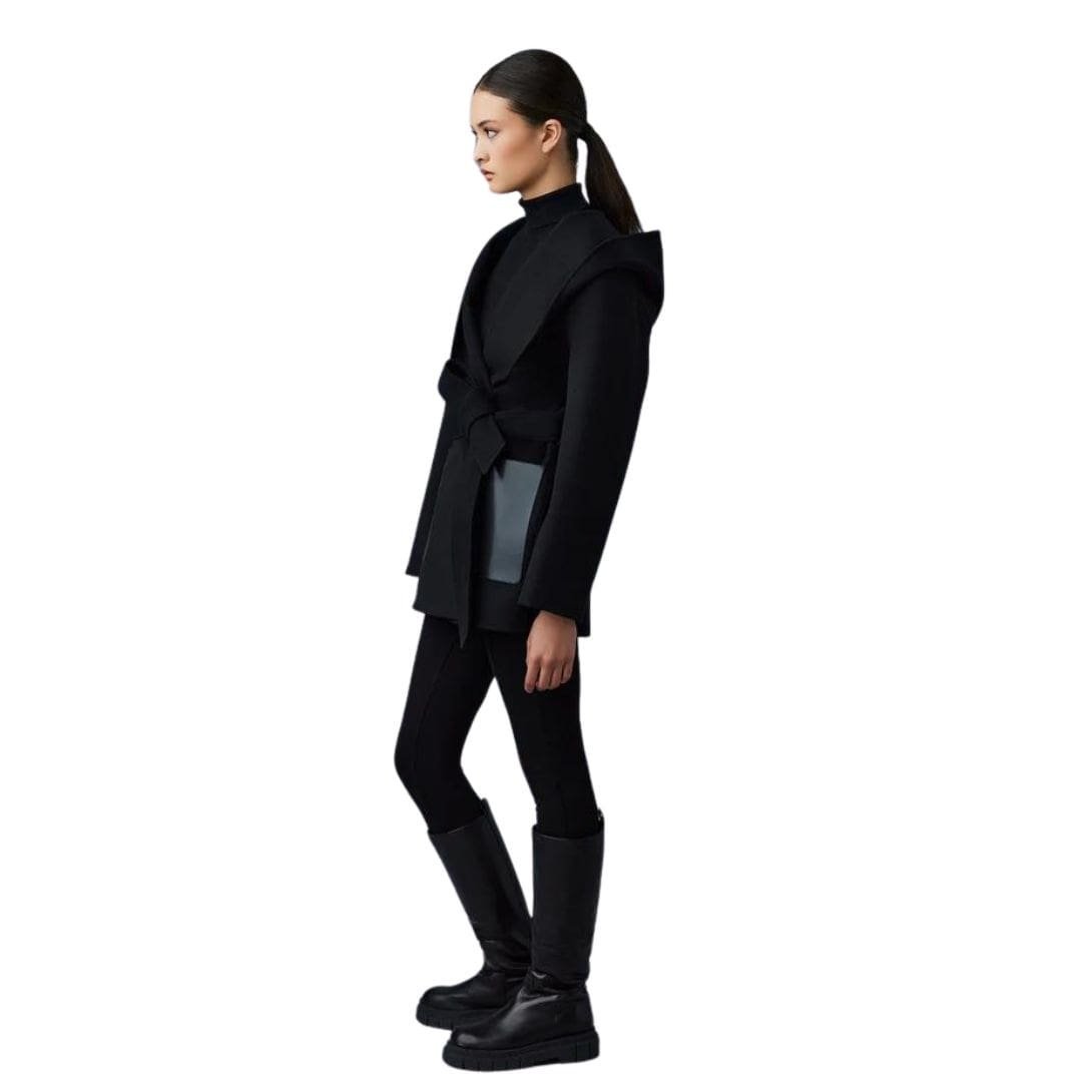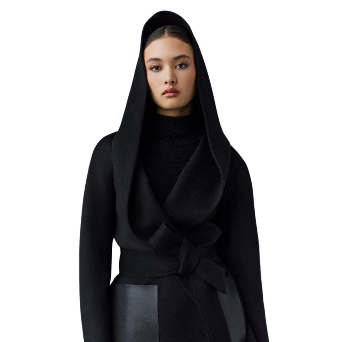 The Mackage Azra Double-Face Wool Wrap Coat coat is a mid-length wrap style designed for women, crafted from exceptionally soft double-face wool. Its relaxed fit and dropped shoulders create a fluid, robe-like silhouette, complemented by a draped hood for a touch of luxury. The waist is cinched with a leather-accented sash, which matches the leather-trimmed patch pockets that feature an embossed logo. This lightweight coat offers a modern twist on a classic design.