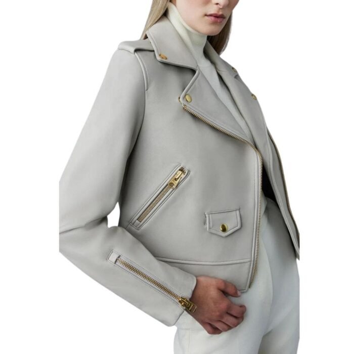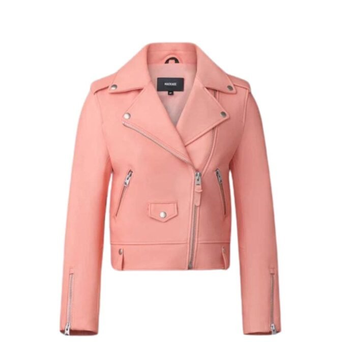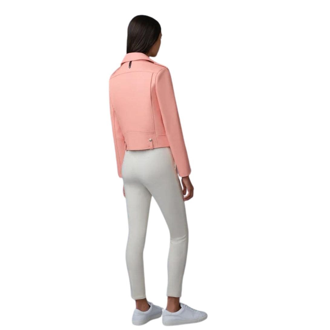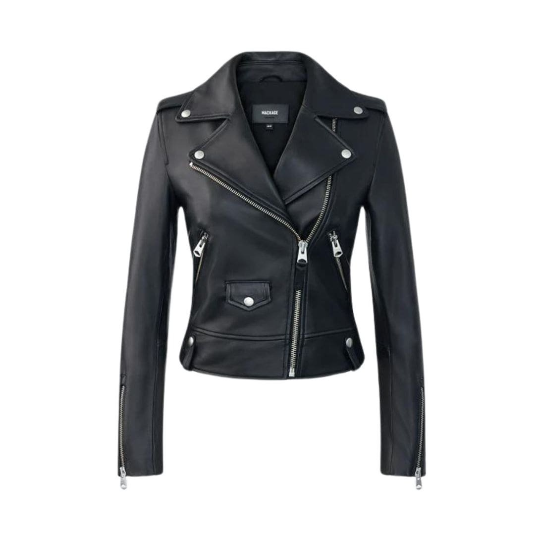 The Mackage Baya (r) Leather Biker Jacket is a women’s biker jacket crafted from supple, sustainable (R) Leather. Designed with a straight silhouette, it features a classic asymmetrical zip front closure and a snap-notch collar. Its relaxed fit and action back provide ease of movement, making it perfect for effortless layering. The jacket is finished with signature silver hardware and zip pockets for a timeless, stylish look.