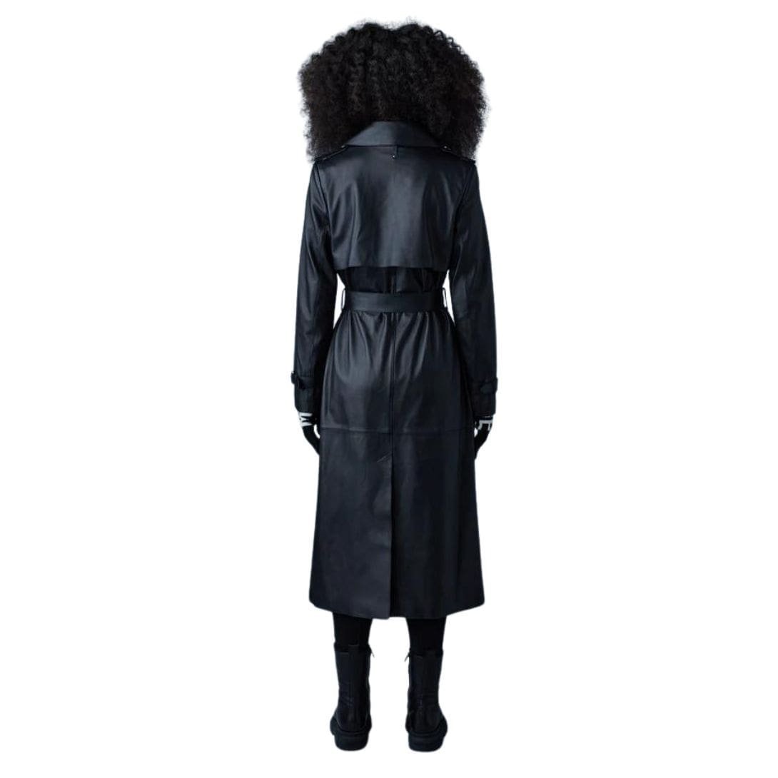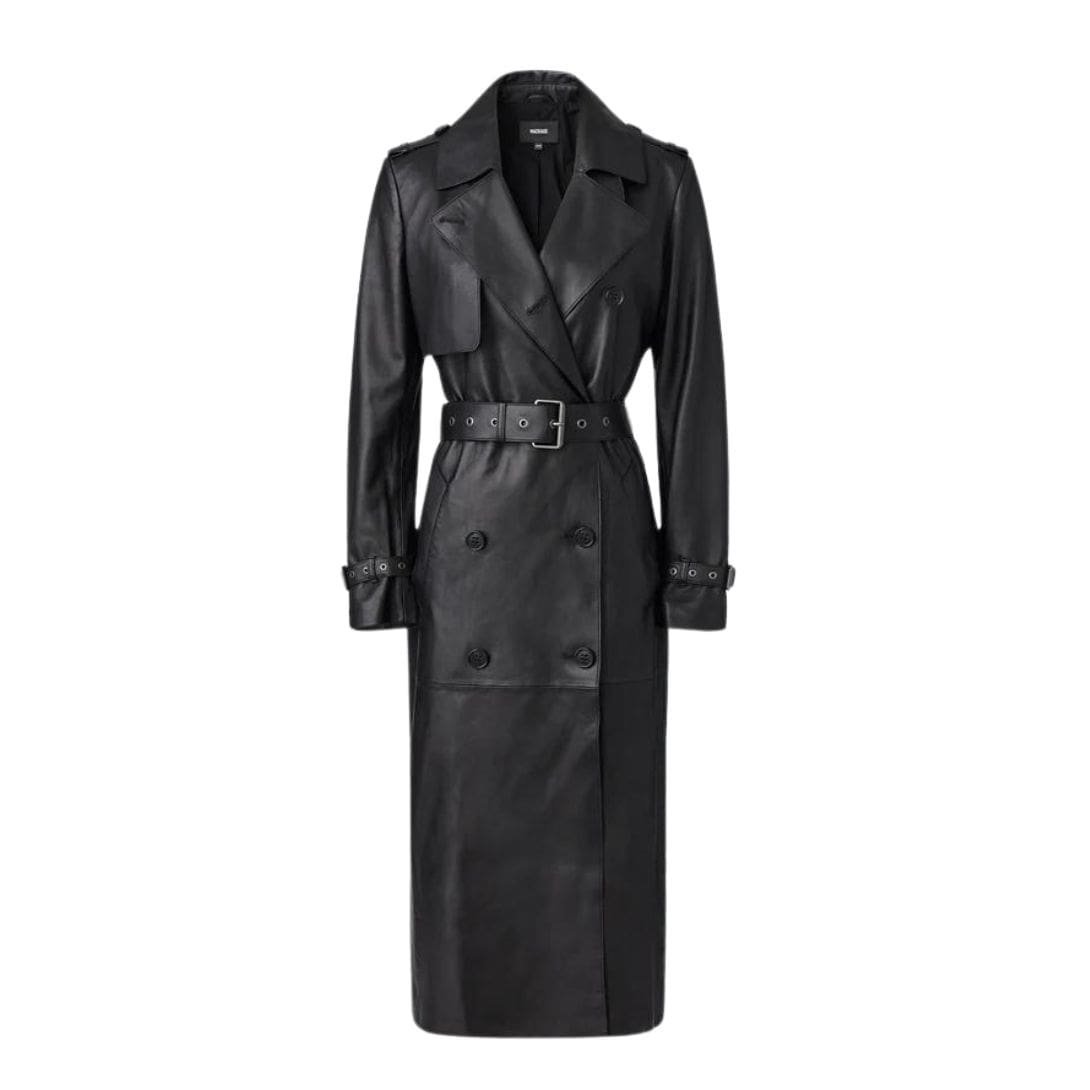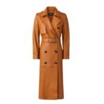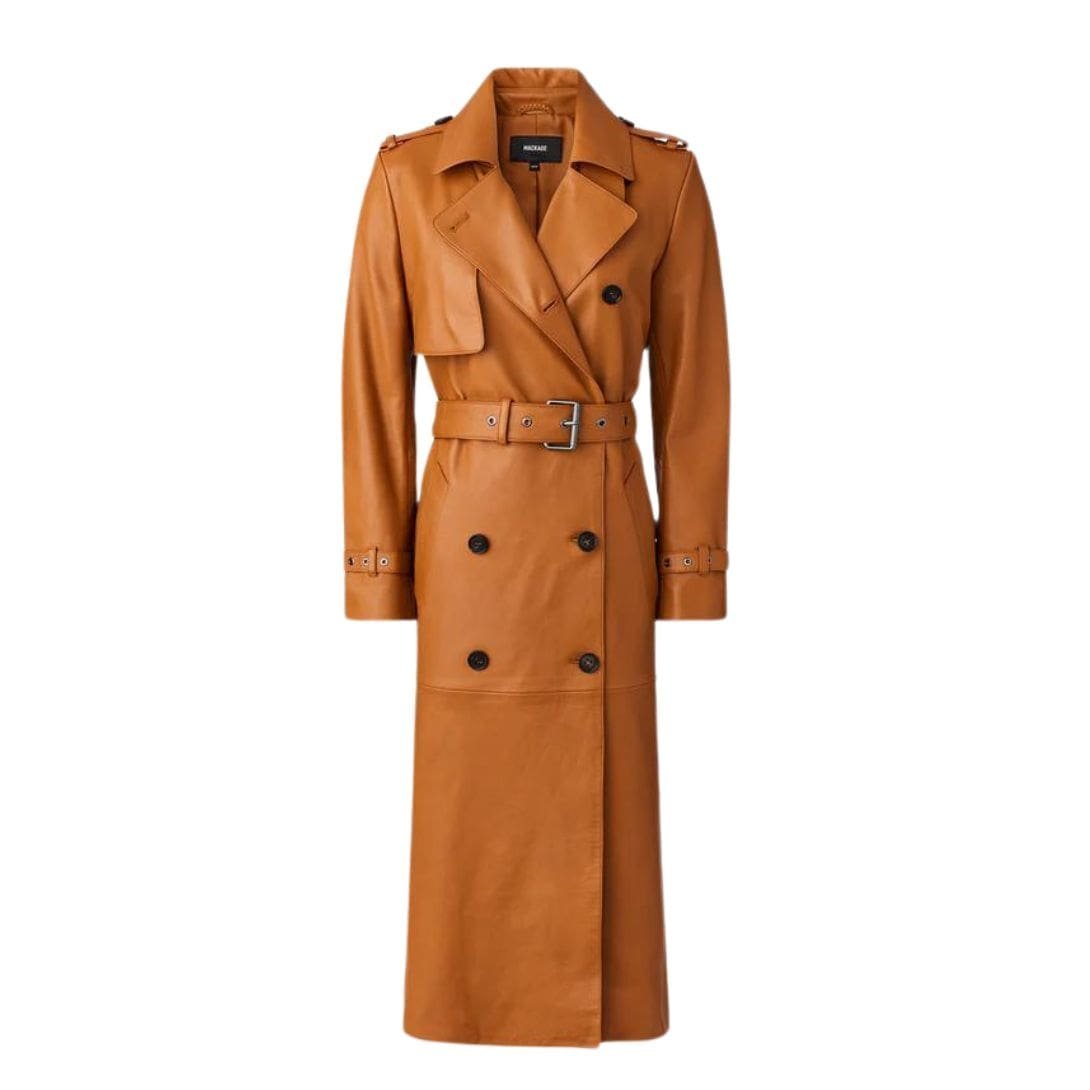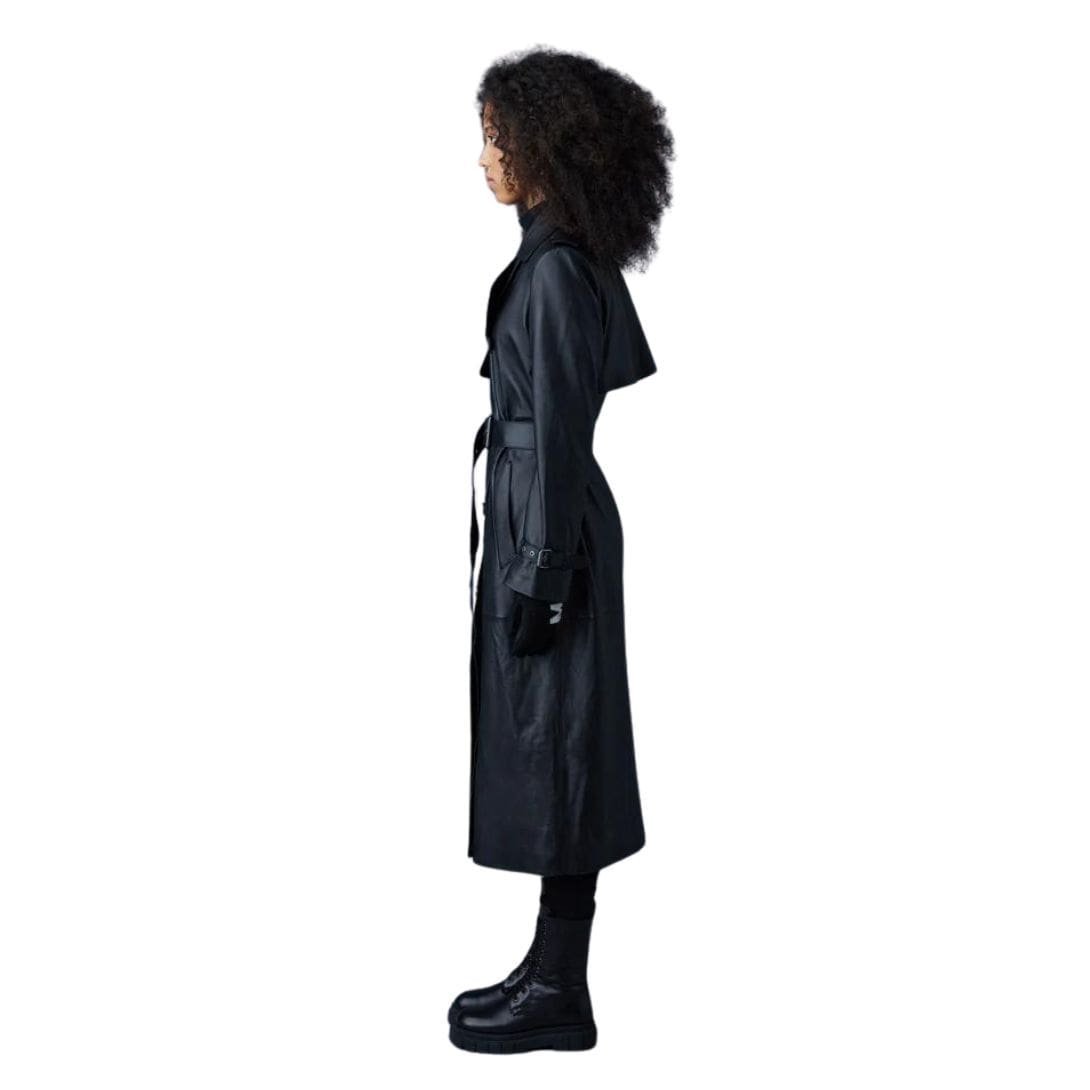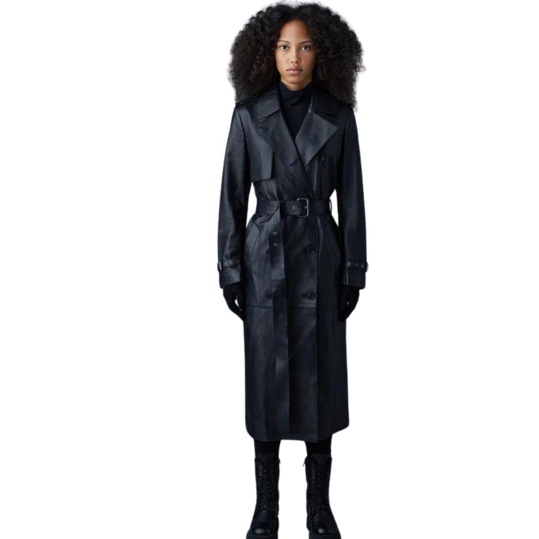 Introducing Mackage Gael-Z Leather Trench Coat with Belt, a masterpiece in the realm of women’s outerwear, meticulously crafted from our renowned (R) Leather. This exquisite double-breasted trench coat exudes confidence with its bold design elements. The wide notch Napoleon lapel, button collar latch, and unique asymmetrical rainshed embody sophistication and style.