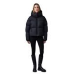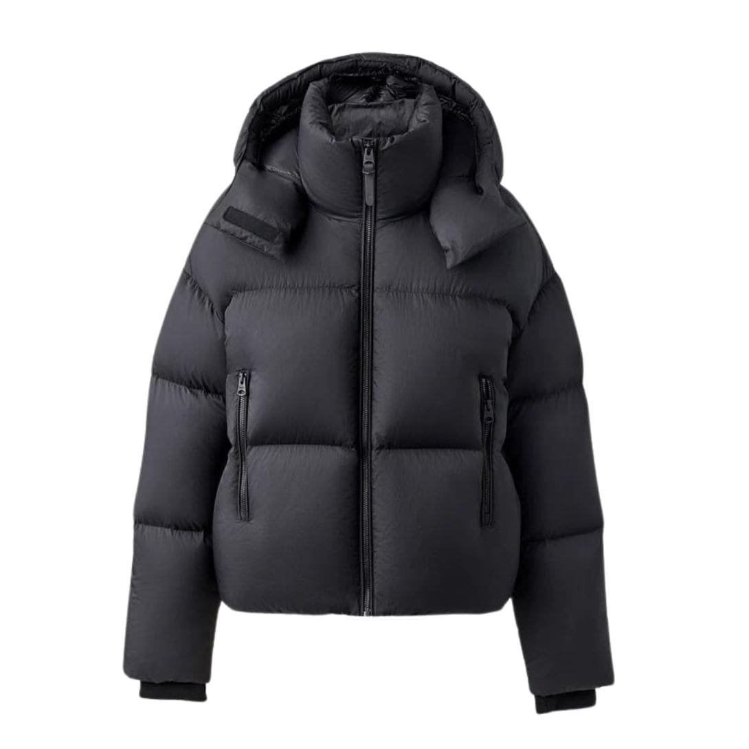 Introducing Mackage Tessy Medium Down Hooded Jacket with Softwash Crinkle Finish, an ultra-light jacket for women crafted from softwash crinkle material for a matte finish. Its 2-way stretch construction ensures ease of movement, while the expertly tailored design features a stand collar with a detachable hood and an adjustable drawcord at the bottom hem. The oversized silhouette is complemented by rib knit storm cuffs and insulated pockets for added warmth. A standout piece with a pillowy matte shell.