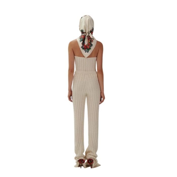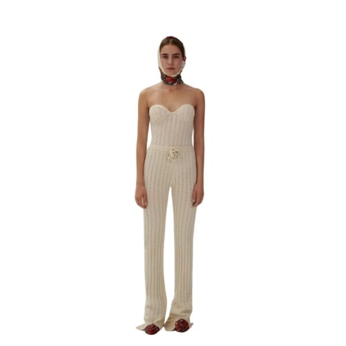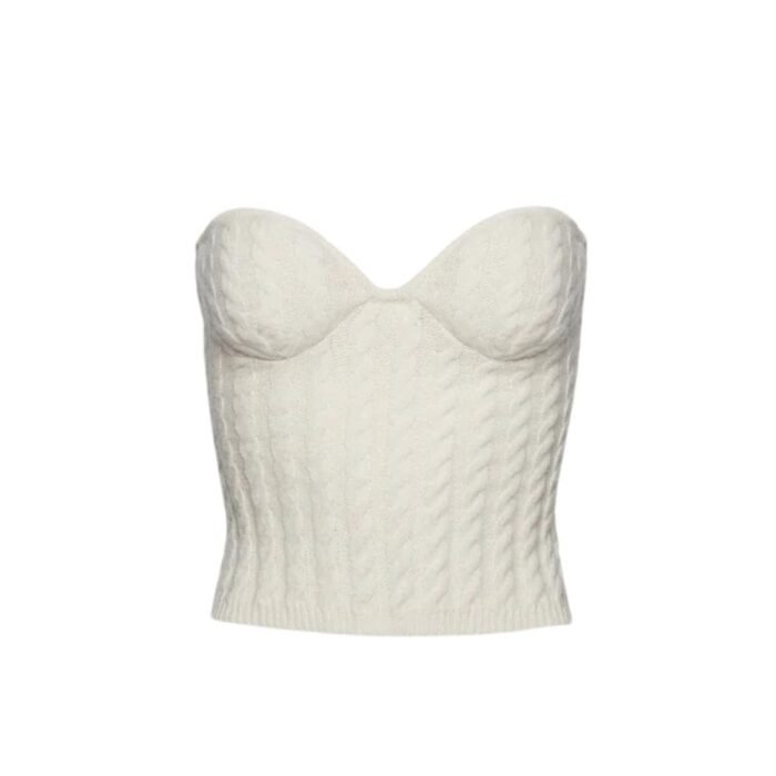In summary, Magda Butrym’s Cable Knit Corset in cream is a best-selling, signature piece that offers a luxurious and stylish addition to any wardrobe. Made from ultra-soft ecological cashmere, it features a beautiful cable knit design and rounded cups for a flattering fit. Versatile and chic, it pairs perfectly with matching pants or other fashion-forward pieces for a standout look.