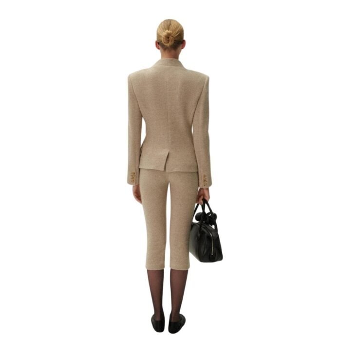 In conclusion, Magda Butrym’s cashmere high-neck jacket is a testament to the brand’s commitment to timeless elegance and exceptional craftsmanship. With its fitted silhouette, collarless high neck, and single-button horn closure, it epitomizes understated luxury and refined femininity. Crafted from sumptuous cashmere, it offers unparalleled comfort and style, making it a wardrobe essential for the discerning woman who values sophistication and grace.